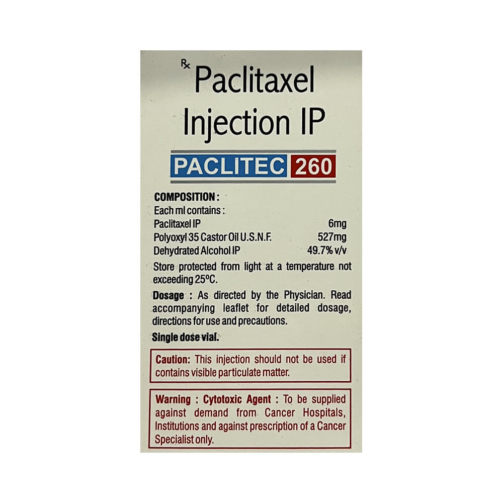 Paclitec 260mg/ml Injection is an anti-cancer medication used for the treatment of breast cancer, pancreatic cancer and non-small cell lung cancer. It is given as an injection by a qualified medical professional. Your doctor will decide what dose is necessary and how often you need to take it. This will depend on what you are being treated for and may change from time to time. You should take it exactly as your doctor has advised. Taking it in the wrong way or taking too much can cause very serious side effects. It may take several weeks or months for you to see or feel the benefits but do not stop taking it unless your doctor tells you to.Some common side effects of this medicine include nausea, vomiting, and weakness. It may also cause serious side effects such as swelling of hands, lips, hair loss, and weight gain. To reduce these side effects your doctor may suggest some medication along with it. But, inform your doctor if you notice unexplained bruising or bleeding, sore throat, mouth ulcers, high temperature (fever). This medicine may reduce the number of blood cells (decrease red blood and white blood cells) in your blood, thereby, increasing the susceptibility to infections. Regular blood tests are required to check your blood cells and liver function.Before taking it, tell your doctor if you have heart disease, liver, or kidney problems or are taking any medicines to treat infections. Many other medicines can affect, or be affected by, this medicine so let your doctor know all medications you are using. This medicine is not recommended during pregnancy or while breastfeeding. The use of effective contraception by both males and females during treatment is important to avoid pregnancy.