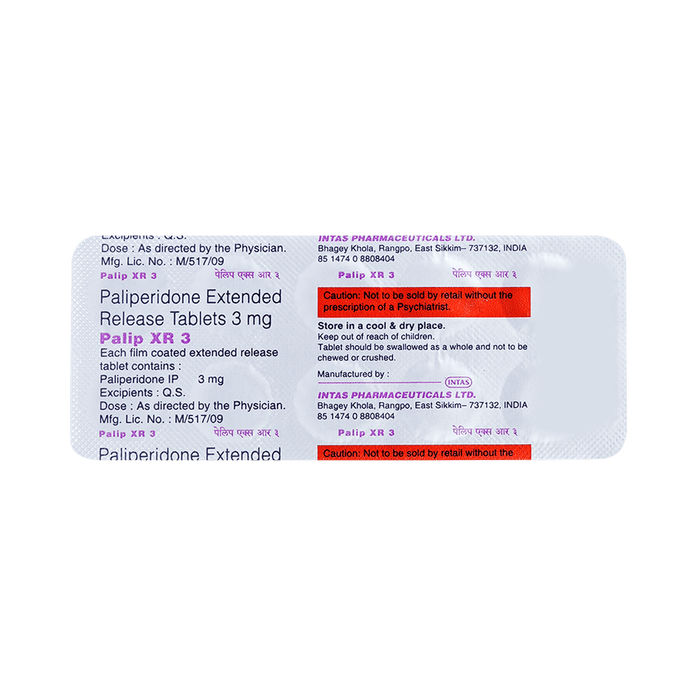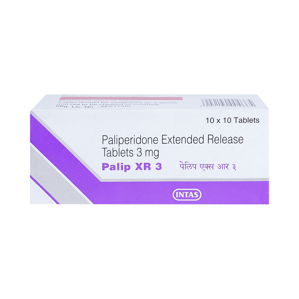 Palip XR 3 Tablet is used in the treatment of schizophrenia (a mental disorder that can result in hallucinations or delusions and also adversely affects a person’s ability to think and behave) and mania. Palip XR 3 Tablet may be taken with or without food. However, it is advised to take it at the same time each day as this helps to maintain a consistent level of medicine in the body. Take this in the dose and duration as advised by your doctor and if you have missed a dose, take it as soon as you remember. This medication mustn't be stopped suddenly without talking to your doctor as it may worsen your symptoms. However, discontinue this medicine immediately if you experience Neuroleptic malignant syndrome (NMS), characterized by fever, muscle rigidity, and altered consciousness.Some common side effects of this medicine include nystagmus (involuntary eye movement) and tremor. It also causes dizziness and sleepiness, so do not drive or do anything that requires mental focus until you know how this medicine affects you.You should be cautious if you are using this medicine as it may increase the risk of developing diabetes, so it is better to monitor glucose regularly. Inform your doctor if you develop any unusual changes in mood or behavior, new or worsening depression, or suicidal thoughts while taking this medicine.