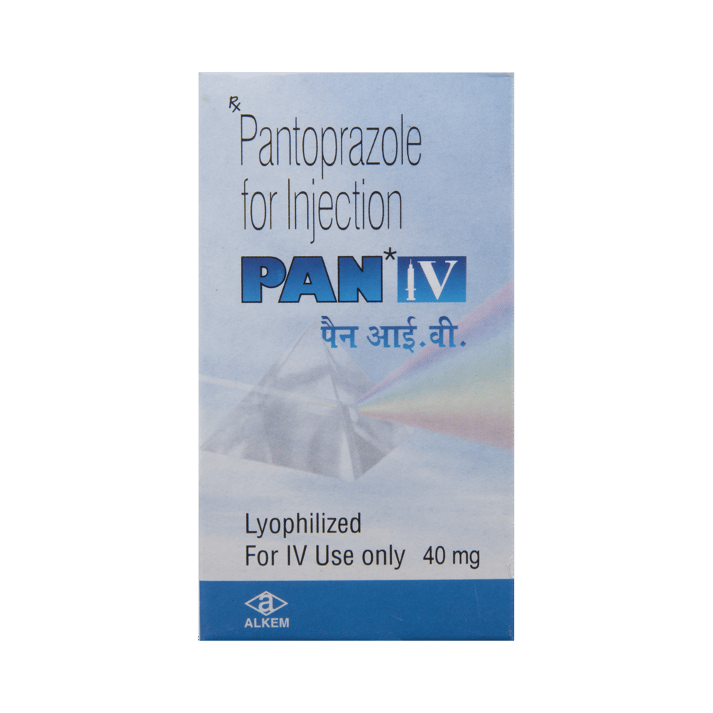 PAN IV Injection is a medicine that reduces the amount of acid produced in your stomach. It is used for treating acid-related diseases of the stomach and intestine such as acid reflux, peptic ulcer disease, Zollinger-Ellison syndrome. It provides relief from symptoms and promotes healing. PAN IV Injection is also used to prevent stress ulcers in seriously ill patients and is administered before anesthetic medication to help prevent aspiration-related complications. It belongs to a class of medicines known as proton pump inhibitors (PPIs). This medicine is administered into a vein by a healthcare professional and will only be given to you if your doctor thinks that an injection is more suitable for you at the moment than a tablet. The dose will depend on your underlying condition and how you respond to the medicine. Your doctor will decide the duration of treatment but you should keep on taking it as prescribed, even if your symptoms disappear quickly. You can increase the efficiency of the treatment by eating smaller meals more often and avoiding caffeinated drinks (like tea and coffee), and spicy or fatty foods.The most common side effects observed with this medicine include nausea, vomiting, headache, dizziness, flatulence, diarrhea, stomach pain, and thrombophlebitis (pain, redness, and swelling of the vein). These symptoms are generally mild but if they bother you or do not go away, consult your doctor. Long-term use of this medicine may lead to an increased risk of side effects. For instance, using this medicine for more than 1 year may increase your risk for bone fractures, especially with higher doses. Talk to your doctor about ways to prevent bone loss (osteoporosis), like taking calcium and vitamin D supplements.PAN IV Injection is not suitable for some people. Before taking this medicine, you need to tell your doctor if you have severe liver problems, are taking medicines for HIV, have ever had an allergic reaction to similar medicines in the past, or suffer from bone loss (osteoporosis). Pregnant or breastfeeding women should also consult their doctor before taking it. Avoid drinking alcohol as it makes your stomach produce excessive acid and can worsen your symptoms. Do not drive or use machinery or tools, if this medicine makes you feel dizzy or sleepy.