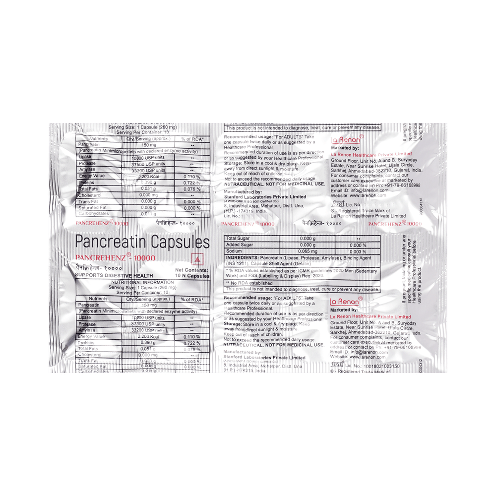 In Treatment of Pancreatic enzyme deficiencyPancrehenz 10000 Capsule is an enzyme supplement for people who do not make enough naturally in their bodies to digest food properly. The enzymes in this medicine help digest food (fats, carbohydrates, and protein) as it passes through the gut. It should be taken with your meal or snack to help it work effectively. Take Pancrehenz 10000 Capsule for as long as it is prescribed for maximum benefits. Some may need it for the rest of their lives. You might also be asked to alter your diet to help with digestion.