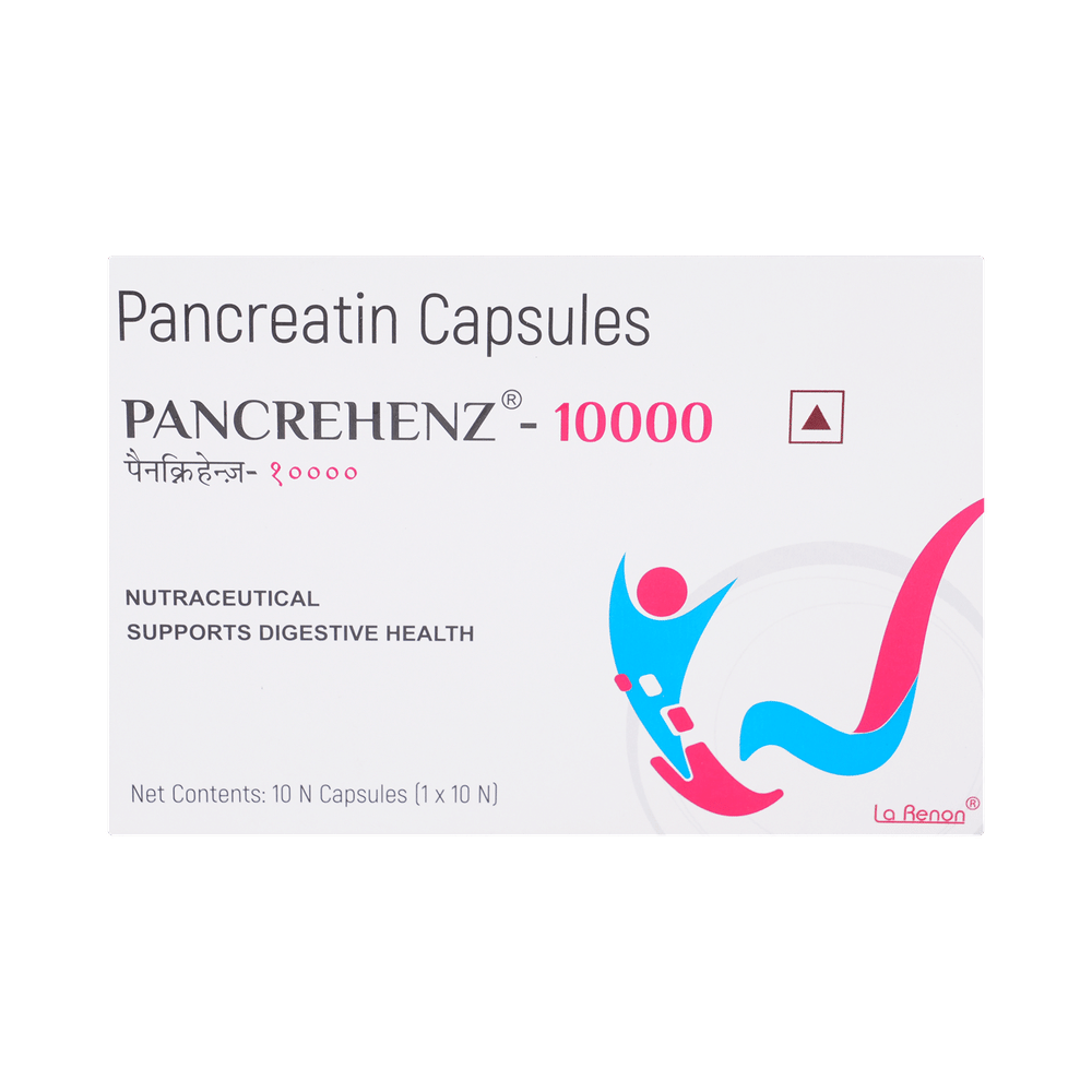 Pancrehenz 10000 Capsule is used to treat pancreatic enzyme deficiency. It is a pancreatic enzyme supplement that helps in digestion. This medicine also reduces stool frequency and stomach discomfort. Pancrehenz 10000 Capsule should be taken during or immediately after eating a meal or a snack with plenty of water. This helps the enzymes mix with the food so they can help digest it. The dose you’re given will depend on your condition and how you respond to the medicine. You should take this medicine until your doctor tells you to stop. You may be taking it for the rest of your life, so get into a routine and make sure you take it regularly. Pancrehenz 10000 Capsule may only be a part of your treatment which could include a special diet.The most common side effects of this medicine include stomach pain, abdominal bloating, and diarrhea. If these bother you or won’t go away, let your doctor know. There may be ways of preventing or reducing these effects.You should let your doctor know if you have gout, asthma, or any allergies. If you have diabetes, this medicine may affect your blood sugar levels and therefore your diabetes treatment. You shouldn’t take it at the same time as an antacid. Talk to your doctor if you’re pregnant or breastfeeding to make sure it’s safe for you. While you’re taking it, your doctor may carry out regular blood tests to make sure it’s helping you.