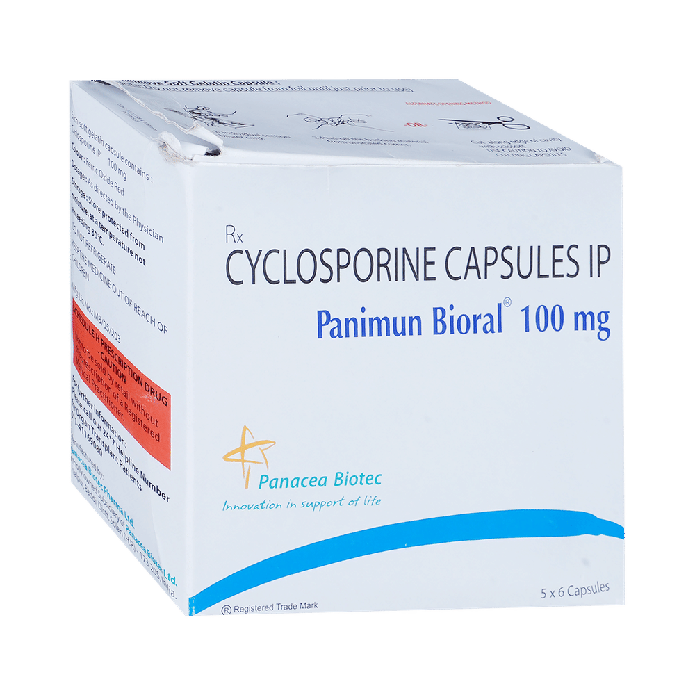 Panimun Bioral 100mg Capsule is used to prevent the body from rejecting a new organ after a liver, kidney, heart transplant, or bone marrow transplantation. It weakens the immune system so that your body does not attack the new organ. It is also used to treat nephrotic syndrome, severe rheumatoid arthritis, and psoriasis. The amount of Panimun Bioral 100mg Capsule you take depends on your weight, medical condition, and what you are being treated for. Your doctor will plan the correct dose for you. Do not change the dose without talking to your doctor. It can be taken with or without food. It is better to take it, in the same way, and at the same time every day to get the maximum benefit. Keep taking it for as long as you have been told to, even if you feel well. Stopping treatment may increase the risk of your transplanted organ being rejected.The most common side effects of this medicine include headache, unusual growth of facial or body hair, high blood pressure, diarrhea, gingival hyperplasia, and tremors. Because it lowers your immune system, you may also catch more infections than usual. Tell your doctor straight away if you develop an infection. For the same reason, you may be more at risk of developing some cancers, particularly of the skin. You should limit your exposure to sunlight.Before taking this medicine you should tell your doctor if you have liver or kidney problems, high blood pressure, gout (increased uric acid levels in the blood), or epilepsy. Also, tell your doctor about all other medicines you are taking as they may affect the working of the medicine. This medicine should only be used in pregnancy if it is clearly needed. However, it is not recommended while breastfeeding. You will have frequent medical tests while taking this medicine to check your blood pressure, liver and kidney function, and mineral levels. The results of tests may lead to changes in your dose.