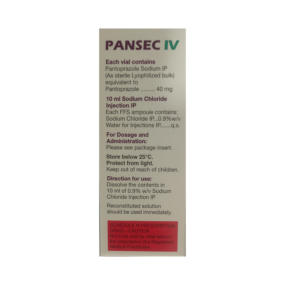 Pansec 40mg Injection is a medicine that reduces the amount of acid produced in your stomach. It is used for treating acid-related diseases of the stomach and intestine such as acid reflux, peptic ulcer disease, Zollinger-Ellison syndrome. It provides relief from symptoms and promotes healing. Pansec 40mg Injection is also used to prevent stress ulcers in seriously ill patients and is administered before anesthetic medication to help prevent aspiration-related complications. It belongs to a class of medicines known as proton pump inhibitors (PPIs). This medicine is administered into a vein by a healthcare professional and will only be given to you if your doctor thinks that an injection is more suitable for you at the moment than a tablet. The dose will depend on your underlying condition and how you respond to the medicine. Your doctor will decide the duration of treatment but you should keep on taking it as prescribed, even if your symptoms disappear quickly. You can increase the efficiency of the treatment by eating smaller meals more often and avoiding caffeinated drinks (like tea and coffee), and spicy or fatty foods.The most common side effects observed with this medicine include nausea, vomiting, headache, dizziness, flatulence, diarrhea, stomach pain, and thrombophlebitis (pain, redness, and swelling of the vein). These symptoms are generally mild but if they bother you or do not go away, consult your doctor. Long-term use of this medicine may lead to an increased risk of side effects. For instance, using this medicine for more than 1 year may increase your risk for bone fractures, especially with higher doses. Talk to your doctor about ways to prevent bone loss (osteoporosis), like taking calcium and vitamin D supplements.Pansec 40mg Injection is not suitable for some people. Before taking this medicine, you need to tell your doctor if you have severe liver problems, are taking medicines for HIV, have ever had an allergic reaction to similar medicines in the past, or suffer from bone loss (osteoporosis). Pregnant or breastfeeding women should also consult their doctor before taking it. Avoid drinking alcohol as it makes your stomach produce excessive acid and can worsen your symptoms. Do not drive or use machinery or tools, if this medicine makes you feel dizzy or sleepy.