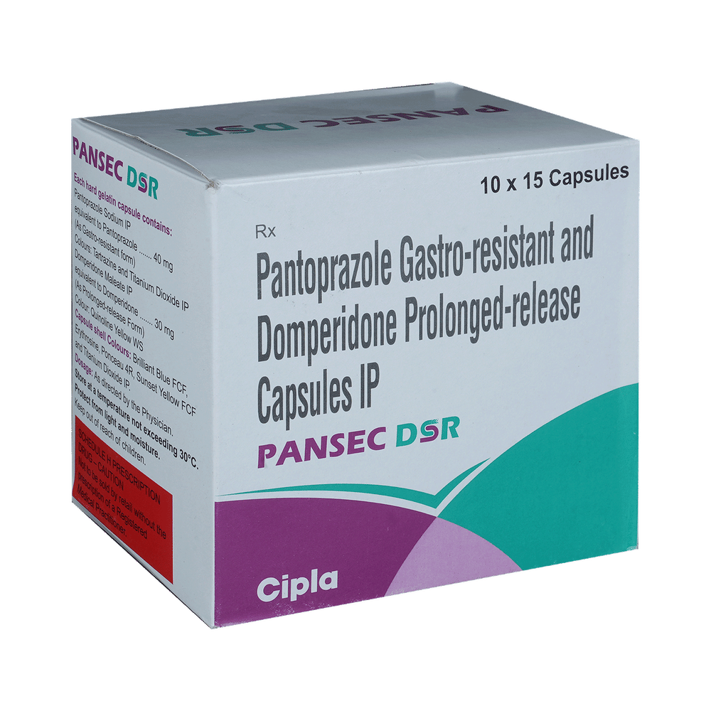 Pansec DSR Capsule is a medicine that is used to treat conditions like acid reflux disease (GERD), erosive esophagitis, gastritis, gastric and duodenal ulcers, and indigestion with symptoms like heartburn, bloating, and regurgitation. It works by lowering acid production and helping the stomach empty faster. Take Pansec DSR Capsule exactly as prescribed by your doctor, usually once daily before breakfast. Swallow it whole with water; do not crush or chew. To get the best results, maintain a healthy diet, avoid late-night meals, caffeine, spicy or oily foods, and stop smoking or alcohol use. Do not skip doses or stop early, even if you feel better, as that may lead to a return of the symptoms.The most common side effect of Pansec DSR Capsule is dry mouth. It may also cause headache, dizziness, diarrhea, nausea, or mild stomach discomfort in some people. These are usually temporary. If you experience persistent vomiting, irregular heartbeat, rash, or severe diarrhea, contact your doctor immediately. Staying hydrated and taking the medicine before meals may help reduce stomach-related side effects.Inform your doctor about any liver, kidney, or heart problems before starting Pansec DSR Capsule. Avoid taking it with other drugs that may affect heart rhythm or interact with domperidone or pantoprazole. Do not use it if you have a history of gastrointestinal bleeding or obstruction, or if you are allergic to any of the ingredients in the medicine. Pregnant or breastfeeding women should consult their doctor before use.