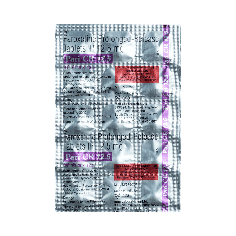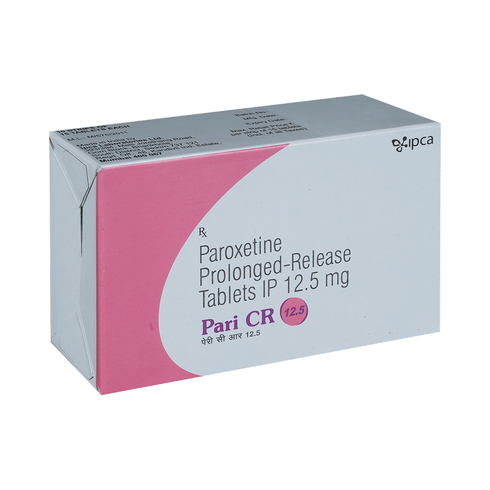 Pari CR 12.5 Tablet is a type of antidepressant belonging to the selective serotonin reuptake inhibitor (SSRI) group of medicines. It is widely prescribed to treat depression and anxiety-related conditions like obsessive-compulsive disorder, and panic disorder. Pari CR 12.5 Tablet helps many people to recover from depression by improving their mood and relieving anxiety and tension. It can be taken with or without food. The dose and how often you need it will be decided by your doctor so that you get the right amount to control your symptoms.Your doctor may start you on a lower dose and increase it gradually. Do not change the dose or stop taking it without talking to your doctor, even if you feel well. Doing so may make your condition worse or you may suffer from unpleasant withdrawal symptoms (anxiety, restlessness, palpitations, dizziness, sleep disturbances, etc).To get the most benefit, take this medicine regularly at the same time each day. Your doctor may advise you to take it in the morning if you have trouble sleeping. It may take a few weeks before you start feeling better. Let your doctor know if you do not see any improvement even after 4 weeks.Some common side effects of Pari CR 12.5 Tablet include nausea, fatigue, dry mouth, loss of appetite, increased sweating, dizziness, nervousness, tremors, insomnia (difficulty in sleeping), and constipation. Sexual side effects like decreased sexual drive, delayed ejaculation, and erectile dysfunction may also be seen. Let your doctor know straight away if you develop any sudden worsening of mood or any thoughts about harming yourself.Before taking this medicine, you should tell your doctor if you have epilepsy (seizure disorder or fits), diabetes, liver or kidney disease, heart problems, or glaucoma. These may affect your treatment. Pregnant or breastfeeding women should also consult their doctor before taking it. Some other medicines may affect the way it works, especially other antidepressants and medicines called MAO inhibitors. Please tell your doctor about all the medicines you are taking to make sure you are safe.