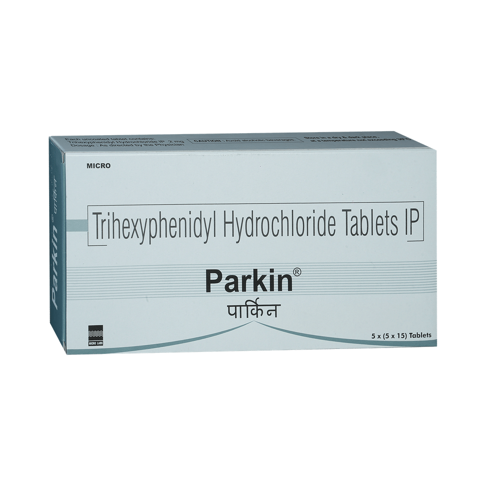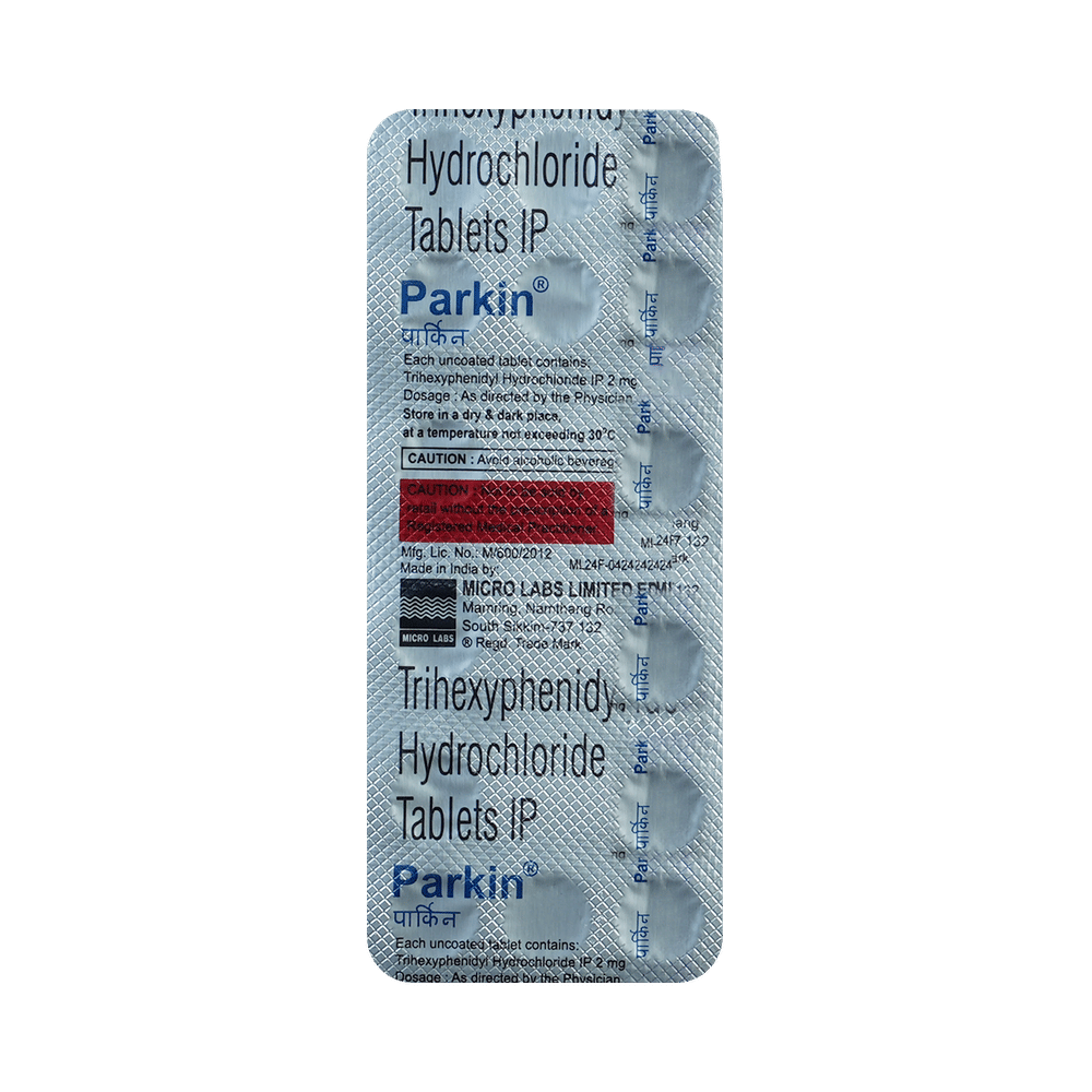 Parkin Tablet is used with other medicines to treat Parkinson’s disease. It’s also used to treat severe movement side effects caused by certain drugs (drug-induced movement disorder). Parkin Tablet can be taken with food or without food. Consider taking it with food if it causes an upset stomach. Take it at the same time each day; this helps maintain a consistent level of medicine in the body. Take this medicine in the dose and duration as advised by your doctor, and if you have missed a dose, take it as soon as you remember. Do not skip any doses and finish the full course of treatment even if you feel better. This medication must not be stopped suddenly without talking to the doctor, as it may result in a worsening of symptoms.Some common side effects of this medicine include nausea, vomiting, and blurred vision. It even causes dizziness and sleepiness, so do not drive or do anything that requires mental focus until you know how this medicine affects you. Dry mouth may occur commonly while using this medicine, so try to do frequent mouth rinses, maintain good oral hygiene, and increase water intake. Avoid wearing contact lenses, as Parkin Tablet may cause dry eyes as well. It is important to inform your doctor if you suffer from glaucoma or have trouble passing urine.Before using Parkin Tablet, you should tell your doctor if you've ever had heart problems, problems with passing urine, liver or kidney disease. It may also affect, or be affected by, some other drugs you are using, so let your doctor know what these are to be safe. Pregnant or breastfeeding mothers should consult their doctor before starting treatment with this medicine.