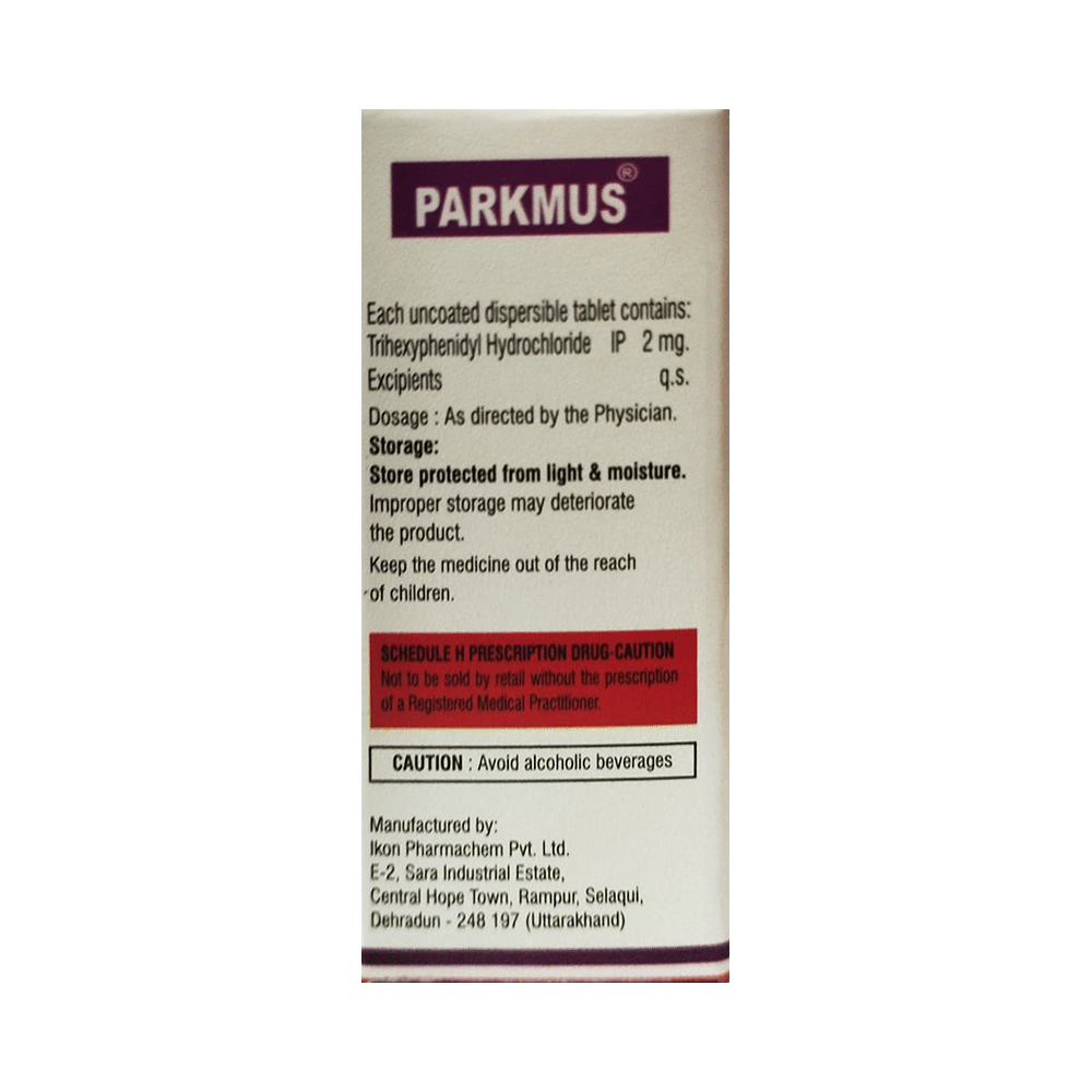 Parkmus Tablet DT is used with other medicines to treat Parkinson’s disease. It’s also used to treat severe movement side effects caused by certain drugs (drug-induced movement disorder). Parkmus Tablet DT can be taken with food or without food. Consider taking it with food if it causes an upset stomach. Take it at the same time each day; this helps maintain a consistent level of medicine in the body. Take this medicine in the dose and duration as advised by your doctor, and if you have missed a dose, take it as soon as you remember. Do not skip any doses and finish the full course of treatment even if you feel better. This medication must not be stopped suddenly without talking to the doctor, as it may result in a worsening of symptoms.Some common side effects of this medicine include nausea, vomiting, and blurred vision. It even causes dizziness and sleepiness, so do not drive or do anything that requires mental focus until you know how this medicine affects you. Dry mouth may occur commonly while using this medicine, so try to do frequent mouth rinses, maintain good oral hygiene, and increase water intake. Avoid wearing contact lenses, as Parkmus Tablet DT may cause dry eyes as well. It is important to inform your doctor if you suffer from glaucoma or have trouble passing urine.Before using Parkmus Tablet DT, you should tell your doctor if you've ever had heart problems, problems with passing urine, liver or kidney disease. It may also affect, or be affected by, some other drugs you are using, so let your doctor know what these are to be safe. Pregnant or breastfeeding mothers should consult their doctor before starting treatment with this medicine.