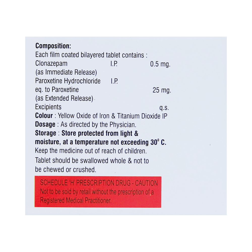 Salt Composition: Paroxetine (25mg) + Clonazepam (0.5mg)