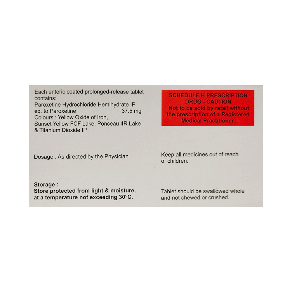 Parona CR 37.5 Tablet is a type of antidepressant belonging to the selective serotonin reuptake inhibitor (SSRI) group of medicines. It is widely prescribed to treat depression and anxiety-related conditions like obsessive-compulsive disorder, and panic disorder. Parona CR 37.5 Tablet helps many people to recover from depression by improving their mood and relieving anxiety and tension. It can be taken with or without food. The dose and how often you need it will be decided by your doctor so that you get the right amount to control your symptoms.Your doctor may start you on a lower dose and increase it gradually. Do not change the dose or stop taking it without talking to your doctor, even if you feel well. Doing so may make your condition worse or you may suffer from unpleasant withdrawal symptoms (anxiety, restlessness, palpitations, dizziness, sleep disturbances, etc).To get the most benefit, take this medicine regularly at the same time each day. Your doctor may advise you to take it in the morning if you have trouble sleeping. It may take a few weeks before you start feeling better. Let your doctor know if you do not see any improvement even after 4 weeks.Some common side effects of Parona CR 37.5 Tablet include nausea, fatigue, dry mouth, loss of appetite, increased sweating, dizziness, nervousness, tremors, insomnia (difficulty in sleeping), and constipation. Sexual side effects like decreased sexual drive, delayed ejaculation, and erectile dysfunction may also be seen. Let your doctor know straight away if you develop any sudden worsening of mood or any thoughts about harming yourself.Before taking this medicine, you should tell your doctor if you have epilepsy (seizure disorder or fits), diabetes, liver or kidney disease, heart problems, or glaucoma. These may affect your treatment. Pregnant or breastfeeding women should also consult their doctor before taking it. Some other medicines may affect the way it works, especially other antidepressants and medicines called MAO inhibitors. Please tell your doctor about all the medicines you are taking to make sure you are safe.