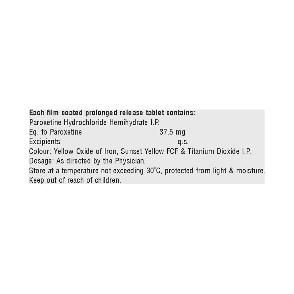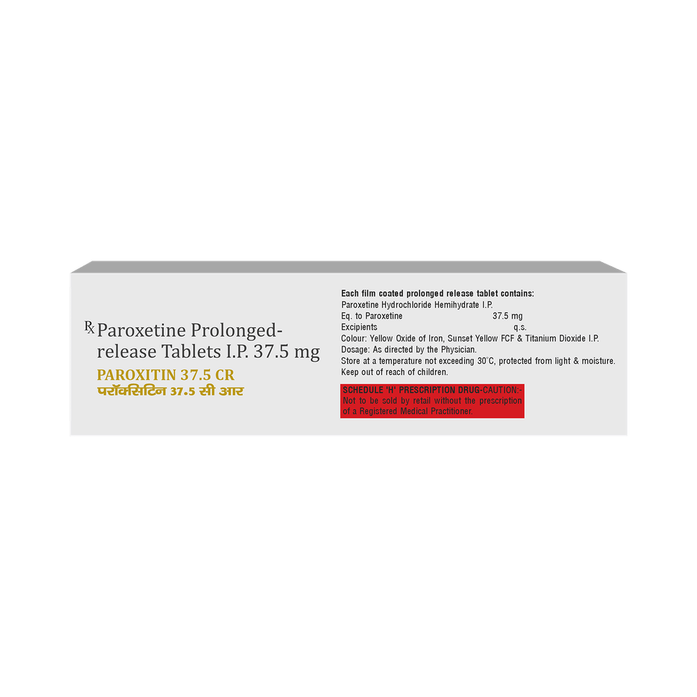 Paroxitin 37.5 CR Tablet is a type of antidepressant belonging to the selective serotonin reuptake inhibitor (SSRI) group of medicines. It is widely prescribed to treat depression and anxiety-related conditions like obsessive-compulsive disorder, and panic disorder. Paroxitin 37.5 CR Tablet helps many people to recover from depression by improving their mood and relieving anxiety and tension. It can be taken with or without food. The dose and how often you need it will be decided by your doctor so that you get the right amount to control your symptoms.Your doctor may start you on a lower dose and increase it gradually. Do not change the dose or stop taking it without talking to your doctor, even if you feel well. Doing so may make your condition worse or you may suffer from unpleasant withdrawal symptoms (anxiety, restlessness, palpitations, dizziness, sleep disturbances, etc).To get the most benefit, take this medicine regularly at the same time each day. Your doctor may advise you to take it in the morning if you have trouble sleeping. It may take a few weeks before you start feeling better. Let your doctor know if you do not see any improvement even after 4 weeks.Some common side effects of Paroxitin 37.5 CR Tablet include nausea, fatigue, dry mouth, loss of appetite, increased sweating, dizziness, nervousness, tremors, insomnia (difficulty in sleeping), and constipation. Sexual side effects like decreased sexual drive, delayed ejaculation, and erectile dysfunction may also be seen. Let your doctor know straight away if you develop any sudden worsening of mood or any thoughts about harming yourself.Before taking this medicine, you should tell your doctor if you have epilepsy (seizure disorder or fits), diabetes, liver or kidney disease, heart problems, or glaucoma. These may affect your treatment. Pregnant or breastfeeding women should also consult their doctor before taking it. Some other medicines may affect the way it works, especially other antidepressants and medicines called MAO inhibitors. Please tell your doctor about all the medicines you are taking to make sure you are safe.