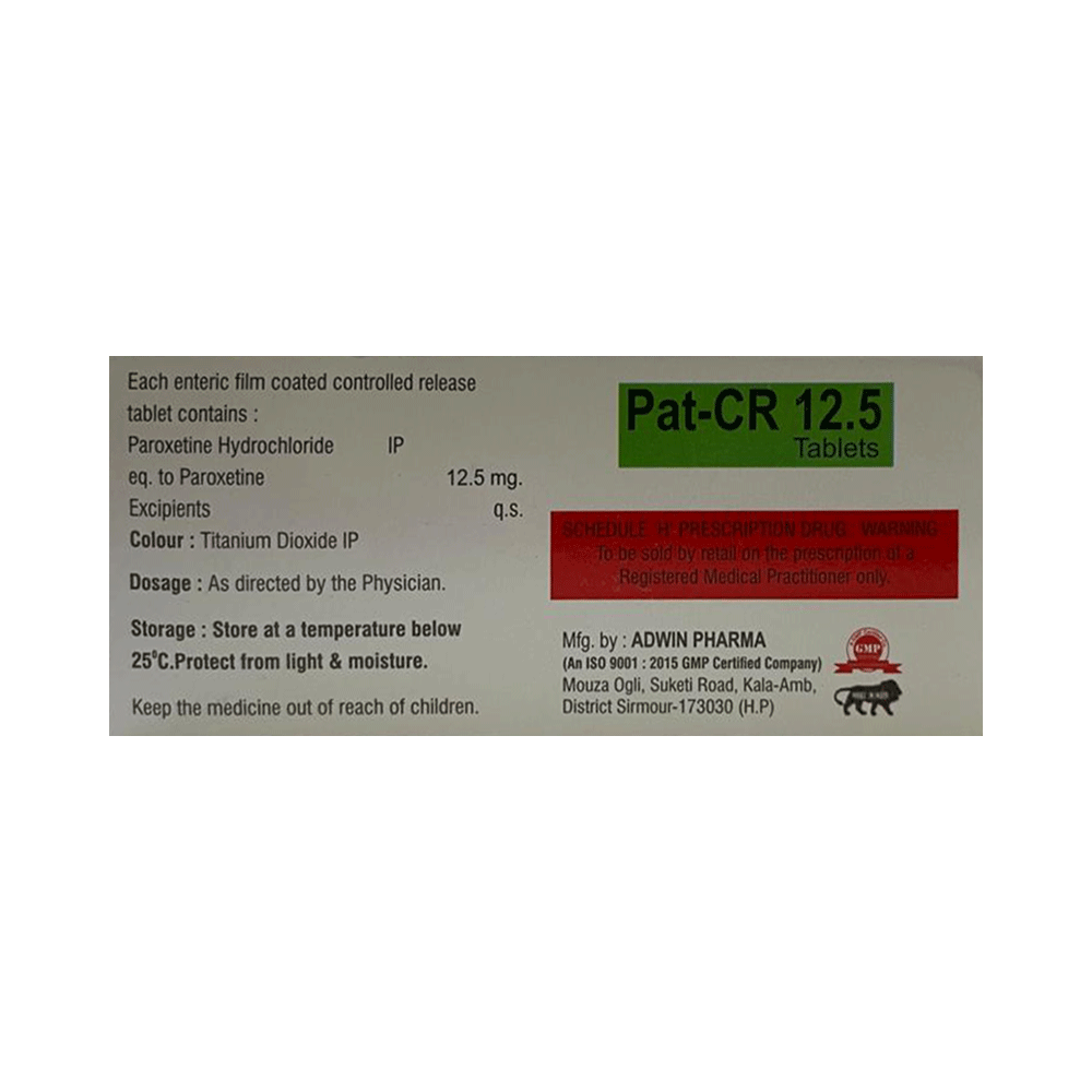 Pat-CR 12.5 Tablet is a type of antidepressant belonging to the selective serotonin reuptake inhibitor (SSRI) group of medicines. It is widely prescribed to treat depression and anxiety-related conditions like obsessive-compulsive disorder, and panic disorder. Pat-CR 12.5 Tablet helps many people to recover from depression by improving their mood and relieving anxiety and tension. It can be taken with or without food. The dose and how often you need it will be decided by your doctor so that you get the right amount to control your symptoms.Your doctor may start you on a lower dose and increase it gradually. Do not change the dose or stop taking it without talking to your doctor, even if you feel well. Doing so may make your condition worse or you may suffer from unpleasant withdrawal symptoms (anxiety, restlessness, palpitations, dizziness, sleep disturbances, etc).To get the most benefit, take this medicine regularly at the same time each day. Your doctor may advise you to take it in the morning if you have trouble sleeping. It may take a few weeks before you start feeling better. Let your doctor know if you do not see any improvement even after 4 weeks.Some common side effects of Pat-CR 12.5 Tablet include nausea, fatigue, dry mouth, loss of appetite, increased sweating, dizziness, nervousness, tremors, insomnia (difficulty in sleeping), and constipation. Sexual side effects like decreased sexual drive, delayed ejaculation, and erectile dysfunction may also be seen. Let your doctor know straight away if you develop any sudden worsening of mood or any thoughts about harming yourself.Before taking this medicine, you should tell your doctor if you have epilepsy (seizure disorder or fits), diabetes, liver or kidney disease, heart problems, or glaucoma. These may affect your treatment. Pregnant or breastfeeding women should also consult their doctor before taking it. Some other medicines may affect the way it works, especially other antidepressants and medicines called MAO inhibitors. Please tell your doctor about all the medicines you are taking to make sure you are safe.