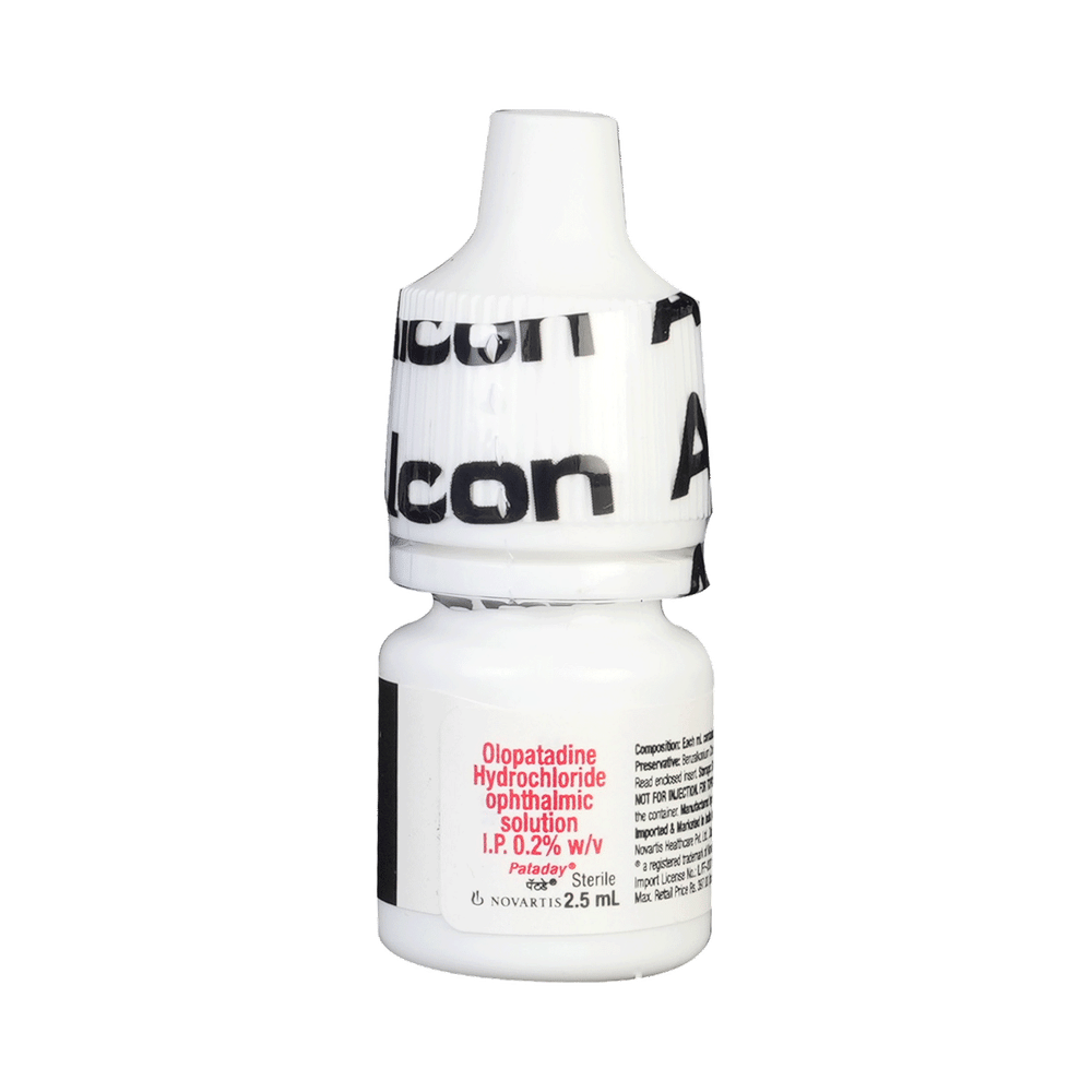 Pataday Ophthalmic Solution is a medicine used to treat allergic conjunctivitis, a condition that causes red, itchy, and watery eyes due to allergens. It works by blocking the effects of histamine and preventing the release of chemicals that cause allergic reactions, providing quick and lasting relief. Use Pataday Ophthalmic Solution exactly as prescribed by your doctor. Typically, it is applied 1-2 times a day, depending on your condition. Wash your hands before using the drops, tilt your head back, and apply one drop into the affected eye(s). Avoid touching the tip of the dropper to prevent contamination. For the best results, use it regularly and at the same time each day.Some common side effects of Pataday Ophthalmic Solution include eye pain, eye irritation, eye discomfort, weakness, and dry mouth. These side effects usually go away on their own after a few minutes. If side effects persist or worsen, or if you experience more severe reactions like swelling, severe itching, or rash, contact your doctor immediately. To prevent side effects, avoid using more drops than prescribed and follow the instructions carefully.While using Pataday Ophthalmic Solution, avoid driving or using machinery immediately after application if you experience blurred vision. If you wear contact lenses, remove them before applying the drops and wait at least 15 minutes before putting them back in. Do not use the drops if you are allergic to the medicine or any of its ingredients. Inform your doctor if you are pregnant, breastfeeding, or using any other medications to avoid potential interactions.