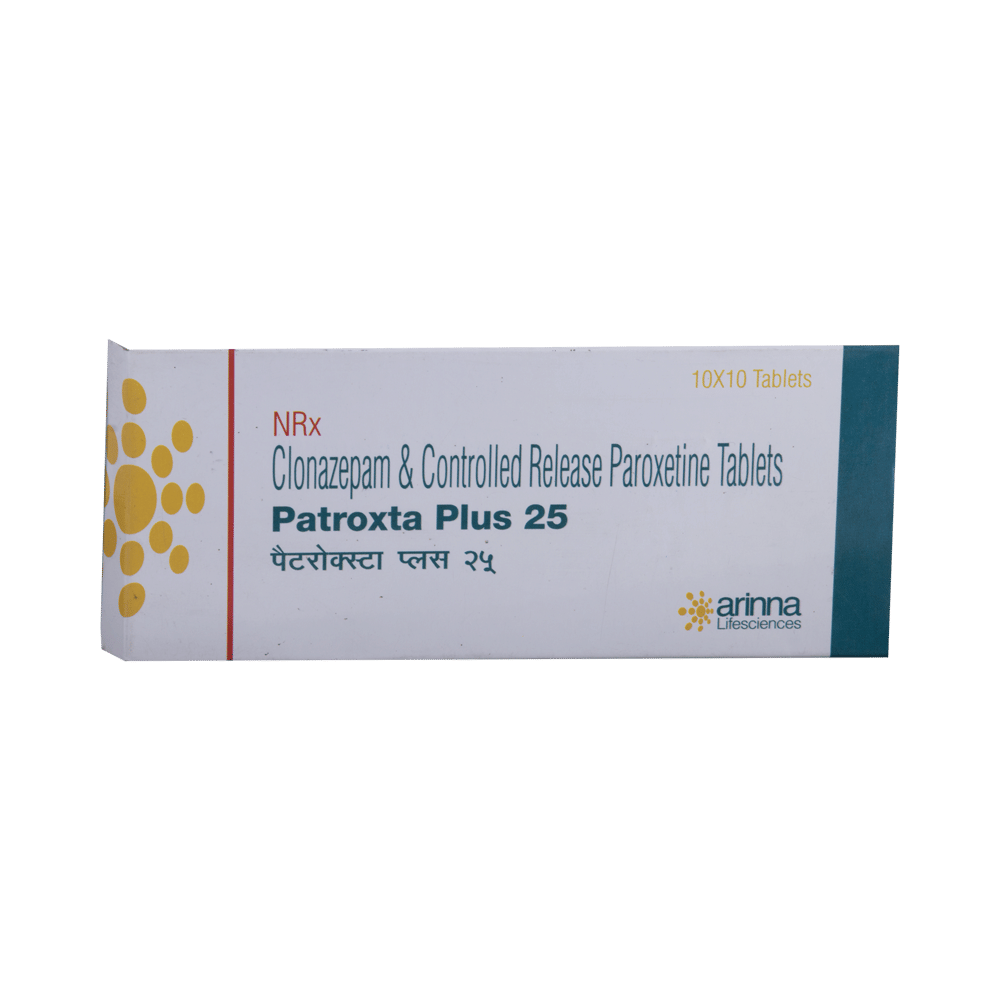 Patroxta Plus 25 Tablet CR is a combination of two medicines, paroxetine and clonazepam, which have mood-enhancing and anxiety-lowering effects. Paroxetine is a selective serotonin reuptake inhibitor (SSRI), which increases the levels of serotonin, a chemical messenger that improves mood. Clonazepam is a benzodiazepine (BZD) that increases the action of GABA, a chemical messenger that suppresses the abnormal activity of the nerve cells in the brain.
