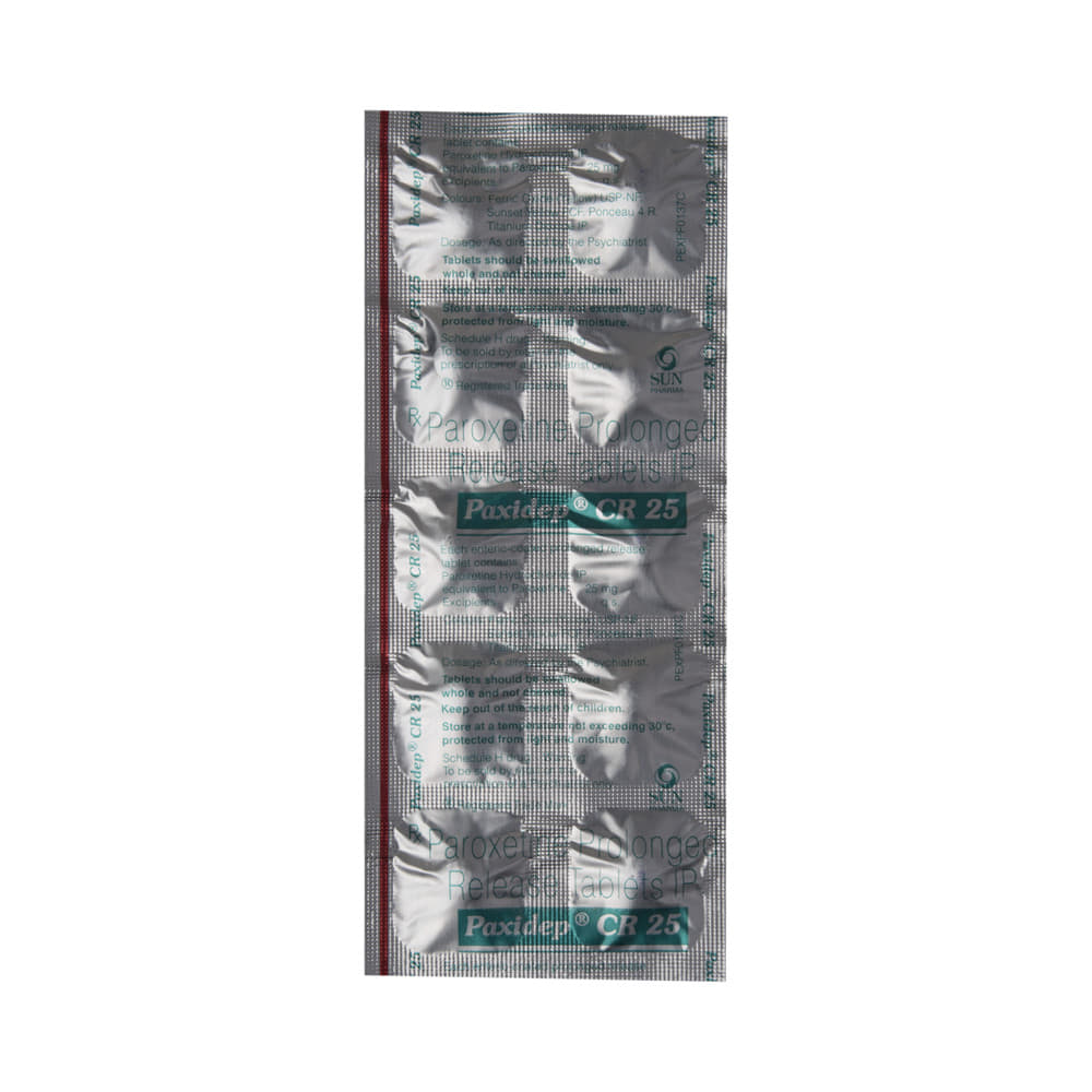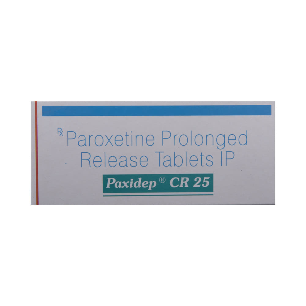 Paxidep CR 25 Tablet is a type of antidepressant belonging to the selective serotonin reuptake inhibitor (SSRI) group of medicines. It is widely prescribed to treat depression and anxiety-related conditions like obsessive-compulsive disorder, and panic disorder. Paxidep CR 25 Tablet helps many people to recover from depression by improving their mood and relieving anxiety and tension. It can be taken with or without food. The dose and how often you need it will be decided by your doctor so that you get the right amount to control your symptoms.Your doctor may start you on a lower dose and increase it gradually. Do not change the dose or stop taking it without talking to your doctor, even if you feel well. Doing so may make your condition worse or you may suffer from unpleasant withdrawal symptoms (anxiety, restlessness, palpitations, dizziness, sleep disturbances, etc).To get the most benefit, take this medicine regularly at the same time each day. Your doctor may advise you to take it in the morning if you have trouble sleeping. It may take a few weeks before you start feeling better. Let your doctor know if you do not see any improvement even after 4 weeks.Some common side effects of Paxidep CR 25 Tablet include nausea, fatigue, dry mouth, loss of appetite, increased sweating, dizziness, nervousness, tremors, insomnia (difficulty in sleeping), and constipation. Sexual side effects like decreased sexual drive, delayed ejaculation, and erectile dysfunction may also be seen. Let your doctor know straight away if you develop any sudden worsening of mood or any thoughts about harming yourself.Before taking this medicine, you should tell your doctor if you have epilepsy (seizure disorder or fits), diabetes, liver or kidney disease, heart problems, or glaucoma. These may affect your treatment. Pregnant or breastfeeding women should also consult their doctor before taking it. Some other medicines may affect the way it works, especially other antidepressants and medicines called MAO inhibitors. Please tell your doctor about all the medicines you are taking to make sure you are safe.