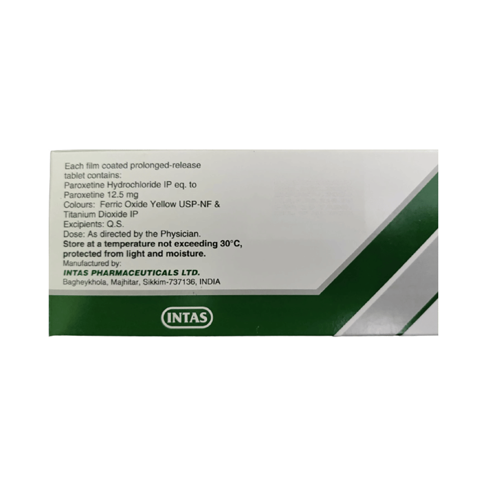 Paxinta CR 12.5 Tablet is a type of antidepressant belonging to the selective serotonin reuptake inhibitor (SSRI) group of medicines. It is widely prescribed to treat depression and anxiety-related conditions like obsessive-compulsive disorder, and panic disorder. Paxinta CR 12.5 Tablet helps many people to recover from depression by improving their mood and relieving anxiety and tension. It can be taken with or without food. The dose and how often you need it will be decided by your doctor so that you get the right amount to control your symptoms.Your doctor may start you on a lower dose and increase it gradually. Do not change the dose or stop taking it without talking to your doctor, even if you feel well. Doing so may make your condition worse or you may suffer from unpleasant withdrawal symptoms (anxiety, restlessness, palpitations, dizziness, sleep disturbances, etc).To get the most benefit, take this medicine regularly at the same time each day. Your doctor may advise you to take it in the morning if you have trouble sleeping. It may take a few weeks before you start feeling better. Let your doctor know if you do not see any improvement even after 4 weeks.Some common side effects of Paxinta CR 12.5 Tablet include nausea, fatigue, dry mouth, loss of appetite, increased sweating, dizziness, nervousness, tremors, insomnia (difficulty in sleeping), and constipation. Sexual side effects like decreased sexual drive, delayed ejaculation, and erectile dysfunction may also be seen. Let your doctor know straight away if you develop any sudden worsening of mood or any thoughts about harming yourself.Before taking this medicine, you should tell your doctor if you have epilepsy (seizure disorder or fits), diabetes, liver or kidney disease, heart problems, or glaucoma. These may affect your treatment. Pregnant or breastfeeding women should also consult their doctor before taking it. Some other medicines may affect the way it works, especially other antidepressants and medicines called MAO inhibitors. Please tell your doctor about all the medicines you are taking to make sure you are safe.