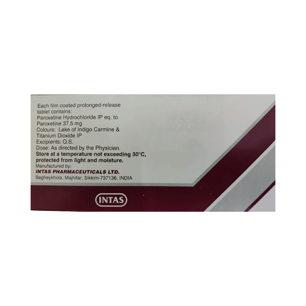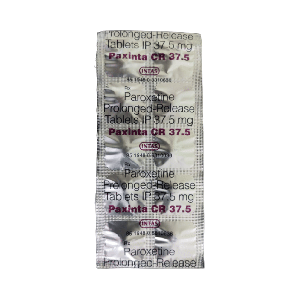 Paxinta CR 37.5 Tablet is a type of antidepressant belonging to the selective serotonin reuptake inhibitor (SSRI) group of medicines. It is widely prescribed to treat depression and anxiety-related conditions like obsessive-compulsive disorder, and panic disorder. Paxinta CR 37.5 Tablet helps many people to recover from depression by improving their mood and relieving anxiety and tension. It can be taken with or without food. The dose and how often you need it will be decided by your doctor so that you get the right amount to control your symptoms.Your doctor may start you on a lower dose and increase it gradually. Do not change the dose or stop taking it without talking to your doctor, even if you feel well. Doing so may make your condition worse or you may suffer from unpleasant withdrawal symptoms (anxiety, restlessness, palpitations, dizziness, sleep disturbances, etc).To get the most benefit, take this medicine regularly at the same time each day. Your doctor may advise you to take it in the morning if you have trouble sleeping. It may take a few weeks before you start feeling better. Let your doctor know if you do not see any improvement even after 4 weeks.Some common side effects of Paxinta CR 37.5 Tablet include nausea, fatigue, dry mouth, loss of appetite, increased sweating, dizziness, nervousness, tremors, insomnia (difficulty in sleeping), and constipation. Sexual side effects like decreased sexual drive, delayed ejaculation, and erectile dysfunction may also be seen. Let your doctor know straight away if you develop any sudden worsening of mood or any thoughts about harming yourself.Before taking this medicine, you should tell your doctor if you have epilepsy (seizure disorder or fits), diabetes, liver or kidney disease, heart problems, or glaucoma. These may affect your treatment. Pregnant or breastfeeding women should also consult their doctor before taking it. Some other medicines may affect the way it works, especially other antidepressants and medicines called MAO inhibitors. Please tell your doctor about all the medicines you are taking to make sure you are safe.