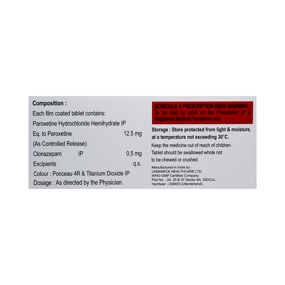 Salt Composition: Paroxetine (12.5mg) + Clonazepam (0.5mg)