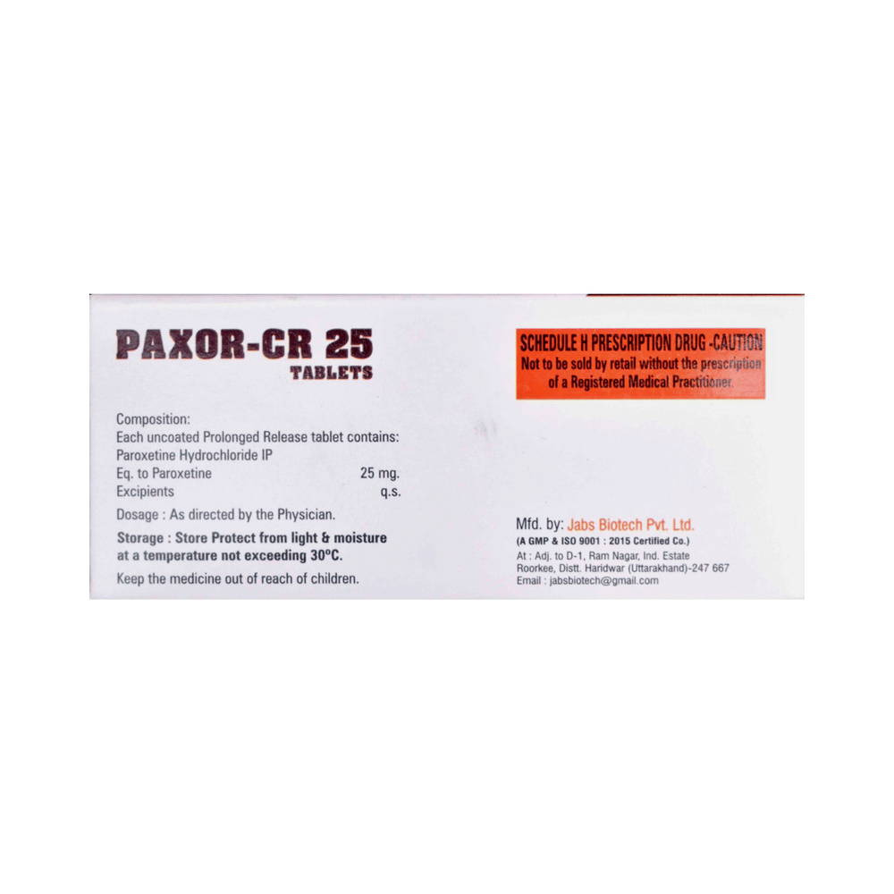 Paxor-CR 25 Tablet is a type of antidepressant belonging to the selective serotonin reuptake inhibitor (SSRI) group of medicines. It is widely prescribed to treat depression and anxiety-related conditions like obsessive-compulsive disorder, and panic disorder. Paxor-CR 25 Tablet helps many people to recover from depression by improving their mood and relieving anxiety and tension. It can be taken with or without food. The dose and how often you need it will be decided by your doctor so that you get the right amount to control your symptoms.Your doctor may start you on a lower dose and increase it gradually. Do not change the dose or stop taking it without talking to your doctor, even if you feel well. Doing so may make your condition worse or you may suffer from unpleasant withdrawal symptoms (anxiety, restlessness, palpitations, dizziness, sleep disturbances, etc).To get the most benefit, take this medicine regularly at the same time each day. Your doctor may advise you to take it in the morning if you have trouble sleeping. It may take a few weeks before you start feeling better. Let your doctor know if you do not see any improvement even after 4 weeks.Some common side effects of Paxor-CR 25 Tablet include nausea, fatigue, dry mouth, loss of appetite, increased sweating, dizziness, nervousness, tremors, insomnia (difficulty in sleeping), and constipation. Sexual side effects like decreased sexual drive, delayed ejaculation, and erectile dysfunction may also be seen. Let your doctor know straight away if you develop any sudden worsening of mood or any thoughts about harming yourself.Before taking this medicine, you should tell your doctor if you have epilepsy (seizure disorder or fits), diabetes, liver or kidney disease, heart problems, or glaucoma. These may affect your treatment. Pregnant or breastfeeding women should also consult their doctor before taking it. Some other medicines may affect the way it works, especially other antidepressants and medicines called MAO inhibitors. Please tell your doctor about all the medicines you are taking to make sure you are safe.