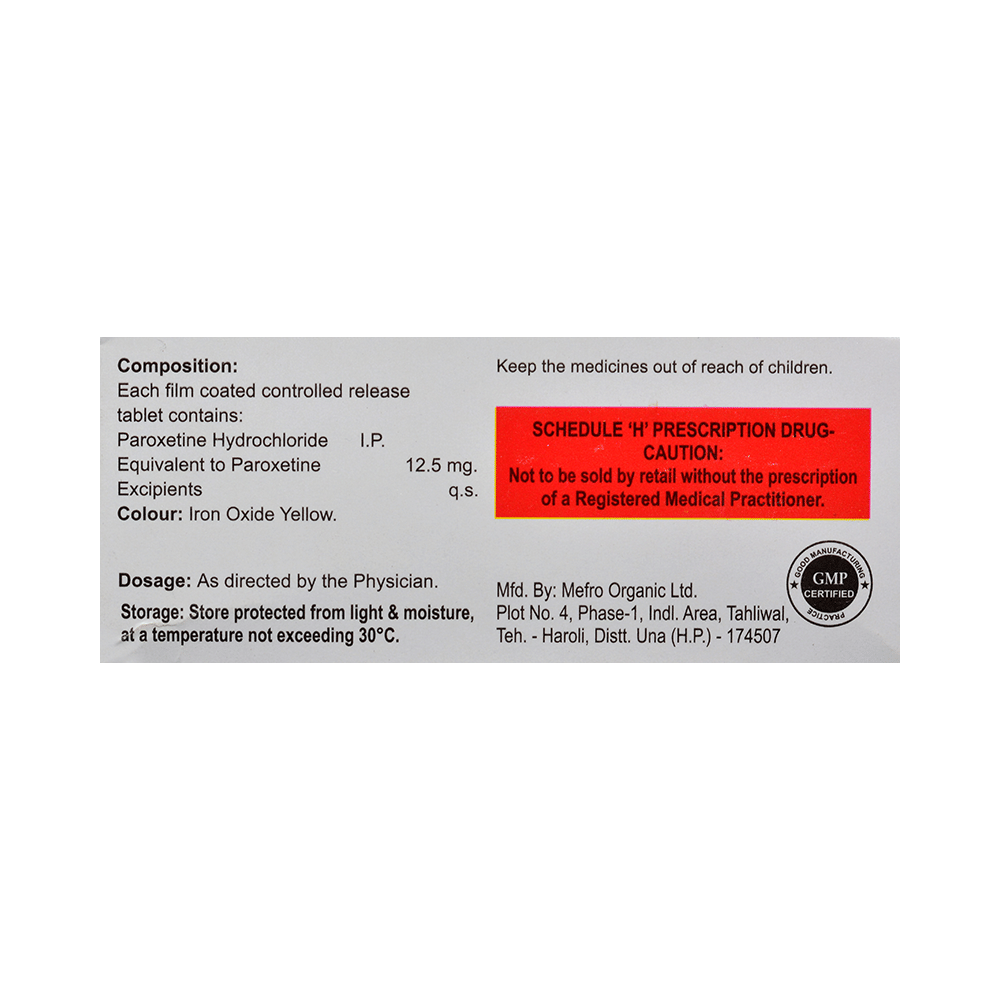 Paxtine 12.5 Tablet CR is a type of antidepressant belonging to the selective serotonin reuptake inhibitor (SSRI) group of medicines. It is widely prescribed to treat depression and anxiety-related conditions like obsessive-compulsive disorder, and panic disorder. Paxtine 12.5 Tablet CR helps many people to recover from depression by improving their mood and relieving anxiety and tension. It can be taken with or without food. The dose and how often you need it will be decided by your doctor so that you get the right amount to control your symptoms.Your doctor may start you on a lower dose and increase it gradually. Do not change the dose or stop taking it without talking to your doctor, even if you feel well. Doing so may make your condition worse or you may suffer from unpleasant withdrawal symptoms (anxiety, restlessness, palpitations, dizziness, sleep disturbances, etc).To get the most benefit, take this medicine regularly at the same time each day. Your doctor may advise you to take it in the morning if you have trouble sleeping. It may take a few weeks before you start feeling better. Let your doctor know if you do not see any improvement even after 4 weeks.Some common side effects of Paxtine 12.5 Tablet CR include nausea, fatigue, dry mouth, loss of appetite, increased sweating, dizziness, nervousness, tremors, insomnia (difficulty in sleeping), and constipation. Sexual side effects like decreased sexual drive, delayed ejaculation, and erectile dysfunction may also be seen. Let your doctor know straight away if you develop any sudden worsening of mood or any thoughts about harming yourself.Before taking this medicine, you should tell your doctor if you have epilepsy (seizure disorder or fits), diabetes, liver or kidney disease, heart problems, or glaucoma. These may affect your treatment. Pregnant or breastfeeding women should also consult their doctor before taking it. Some other medicines may affect the way it works, especially other antidepressants and medicines called MAO inhibitors. Please tell your doctor about all the medicines you are taking to make sure you are safe.