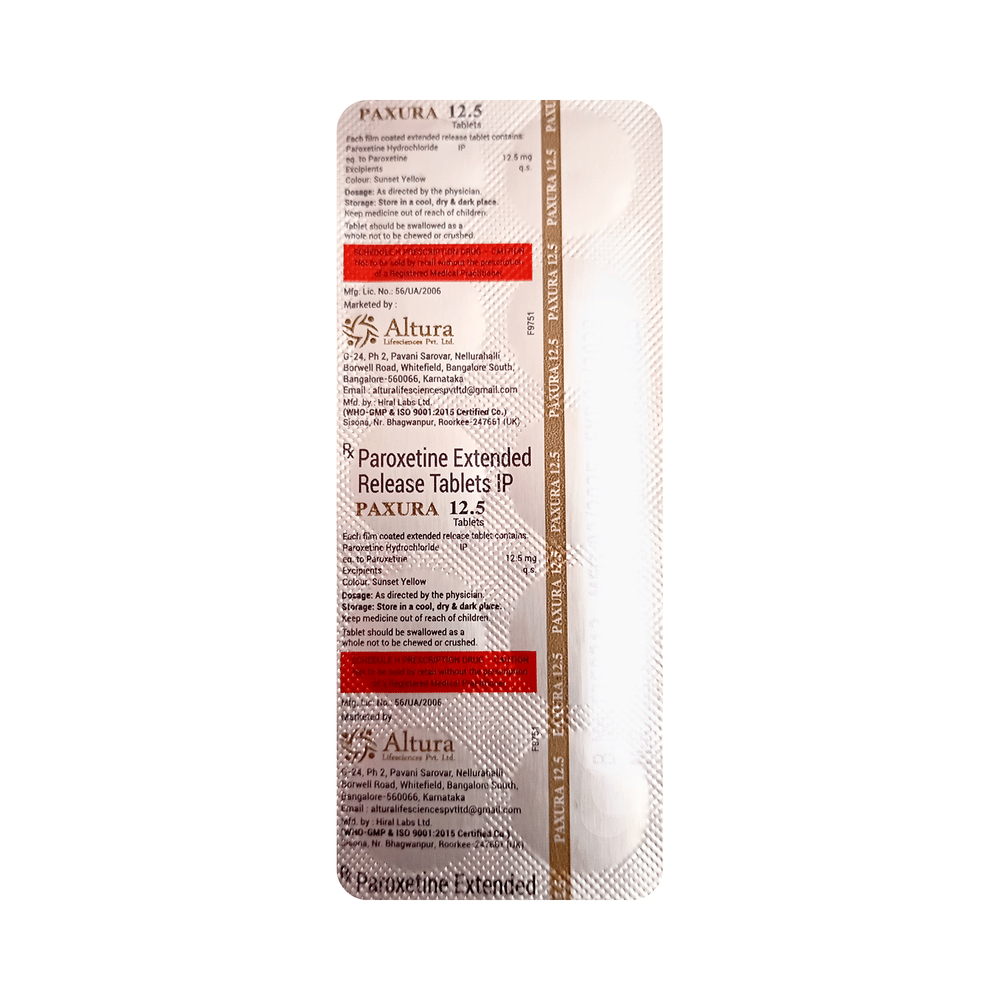 Paxura 12.5 Tablet is a type of antidepressant belonging to the selective serotonin reuptake inhibitor (SSRI) group of medicines. It is widely prescribed to treat depression and anxiety-related conditions like obsessive-compulsive disorder, and panic disorder. Paxura 12.5 Tablet helps many people to recover from depression by improving their mood and relieving anxiety and tension. It can be taken with or without food. The dose and how often you need it will be decided by your doctor so that you get the right amount to control your symptoms.Your doctor may start you on a lower dose and increase it gradually. Do not change the dose or stop taking it without talking to your doctor, even if you feel well. Doing so may make your condition worse or you may suffer from unpleasant withdrawal symptoms (anxiety, restlessness, palpitations, dizziness, sleep disturbances, etc).To get the most benefit, take this medicine regularly at the same time each day. Your doctor may advise you to take it in the morning if you have trouble sleeping. It may take a few weeks before you start feeling better. Let your doctor know if you do not see any improvement even after 4 weeks.Some common side effects of Paxura 12.5 Tablet include nausea, fatigue, dry mouth, loss of appetite, increased sweating, dizziness, nervousness, tremors, insomnia (difficulty in sleeping), and constipation. Sexual side effects like decreased sexual drive, delayed ejaculation, and erectile dysfunction may also be seen. Let your doctor know straight away if you develop any sudden worsening of mood or any thoughts about harming yourself.Before taking this medicine, you should tell your doctor if you have epilepsy (seizure disorder or fits), diabetes, liver or kidney disease, heart problems, or glaucoma. These may affect your treatment. Pregnant or breastfeeding women should also consult their doctor before taking it. Some other medicines may affect the way it works, especially other antidepressants and medicines called MAO inhibitors. Please tell your doctor about all the medicines you are taking to make sure you are safe.