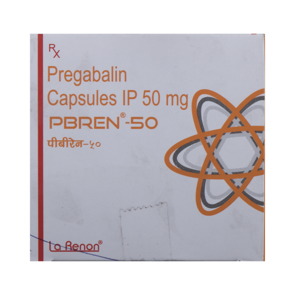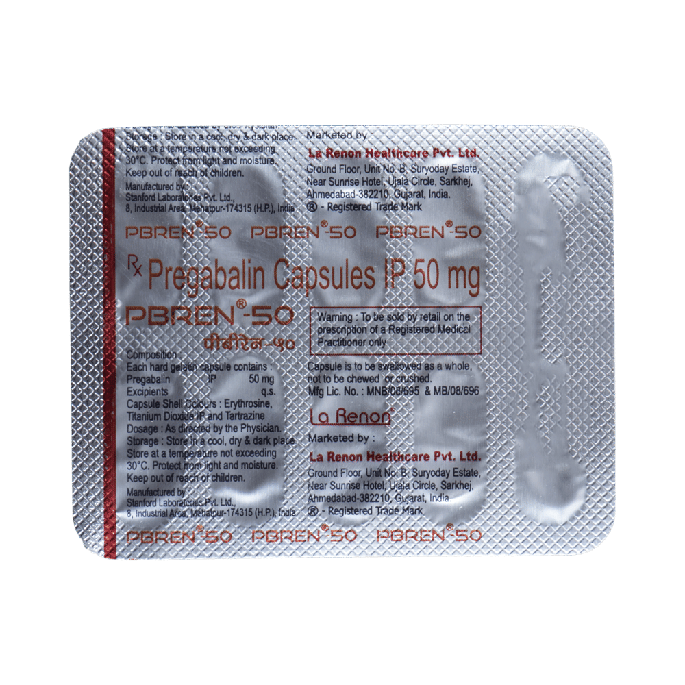 Pbren 50 Capsule is a medicine used to relieve pain caused by nerve damage (neuropathic pain) due to diabetes, shingles (herpes zoster infection), spinal cord injury, or other conditions. It is also used to treat widespread muscle pain and stiffness in people with fibromyalgia. Pbren 50 Capsule belongs to the anti-epileptic group of medicines and can also be used to treat certain types of seizures (fits) in combination with other medicines. Additionally, it may also be prescribed to treat the symptoms of anxiety disorder if other medicines are not suitable.You can take Pbren 50 Capsule with or without food, but it is important to take this medicine at the same time each day to get the most benefit. The exact dose and duration of treatment will depend on your condition and how you respond to it. Your doctor will probably start this medicine at a low dose and increase it gradually. It may take a few weeks for the medicine to work properly. Follow your doctor’s instructions and continue taking it regularly until your doctor advises you to stop. Do not miss any dose, otherwise, your condition may worsen.The side effects of this medicine are usually mild and go away by themselves. The most common ones are feeling sleepy or dizzy, dryness in the mouth, blurred vision, weight gain, edema (swelling over the whole body), and difficulty in concentrating. Most side effects are not serious and do not need medical attention. Talk to your doctor about potential side effects and ways in which you might prevent or cope with them.Before taking the medicine you should tell your doctor if you are pregnant, breastfeeding, or planning to become pregnant. Be careful while driving as sleepiness, dizziness, and blurring of vision may be seen as side effects. You should avoid drinking alcohol along with this medicine as it may lead to excessive sleepiness and dizziness.