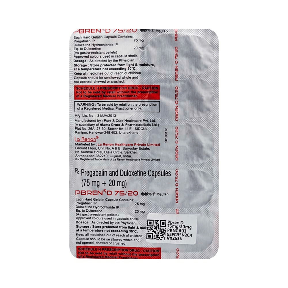 Pbren D 75mg/20mg Capsule is used for the treatment of neuropathic pain. It decreases pain by controlling calcium channel activity of the nerve cells. It also increases the level of chemical messengers in the brain that helps maintain mental balance and stop the movement of pain signals in the brain. Pbren D 75mg/20mg Capsule can be taken with or without food. However, it is advised to take it at the same time each day as this helps to maintain a consistent level of medicine in the body. Take this medicine in the dose and duration advised by your doctor as this is habit forming medicine. If you miss a dose of this medicine, take it as soon as you remember. Finish the full course of the treatment even if you feel better. It is important not to stop taking this medicine suddenly as it may worsen your symptoms.Some common side effects of this medicine include peripheral edema, nausea, headache, dryness of mouth, difficulty in concentration and blurred vision. It may cause dizziness and sleepiness, so do not drive or do anything that requires mental focus until you know how this medicine affects you. This medicine may cause weight gain and to control it, you should have a balanced diet and exercise regularly. It is important to inform your doctor if you develop any unusual changes in mood or behavior, new or worsening depression, or suicidal thoughts.Before taking this medicine let your doctor know if you suffer from kidney or liver disease. Your doctor should also know about all other medicines you are taking as many of these may make this medicine less effective or change the way it works. Inform your doctor if you are pregnant, planning pregnancy or breastfeeding.