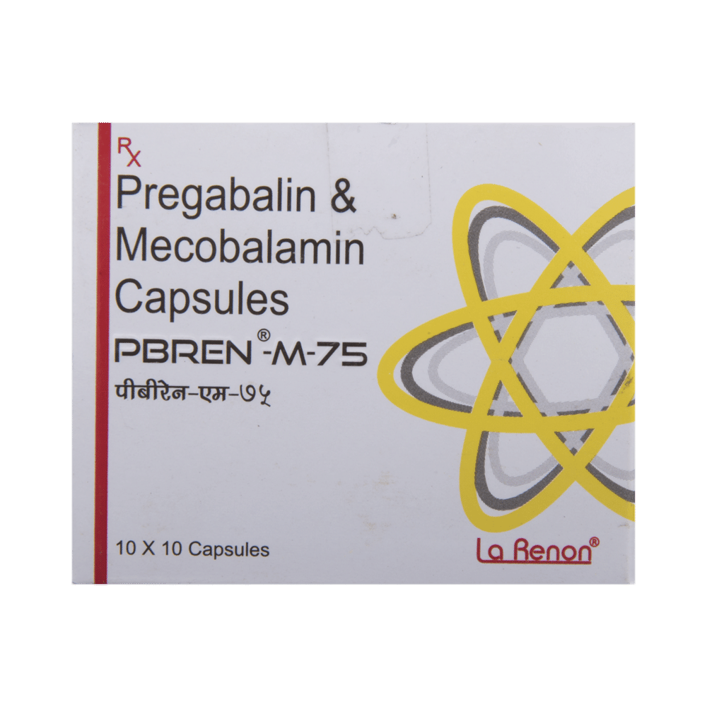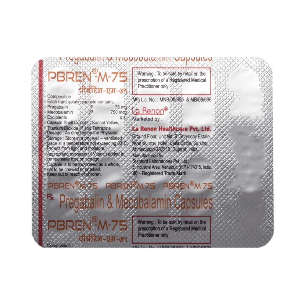 Pbren-M 75 Capsule is a prescription medicine used for the treatment of neuropathic pain. It decreases pain by modulating the calcium channel activity of the nerve cells. This medicine also protects nerve fibers and heals damaged nerve cells. Pbren-M 75 Capsule may be taken with or without food, preferably at bedtime. It is advised to take it at the same time each day as this helps to maintain a consistent level of medicine in the body. Take this medicine in the dose and duration advised by your doctor. If you miss a dose of this medicine, take it as soon as you remember. Finish the full course of treatment even if you feel better. This medication must not be stopped suddenly without talking to the doctor.Some common side effects of this medicine include nausea, vomiting, diarrhea, constipation, blurred vision, dizziness, and sleepiness. Do not drive or do anything that requires mental focus until you know how this medicine affects you. The side effects are mild and usually improve with time. It may also cause weight gain in some people. Exercise regularly and have a balanced diet to keep your weight in check. Inform your doctor if you develop any unusual changes in mood or behavior, new or worsening depression, or suicidal thoughts.Your doctor should also know about all other medicines you are taking, as many of these may make this medicine less effective or change the way it works. Inform your doctor if you are pregnant, planning pregnancy, or breastfeeding to make sure it is safe for you and the developing baby.