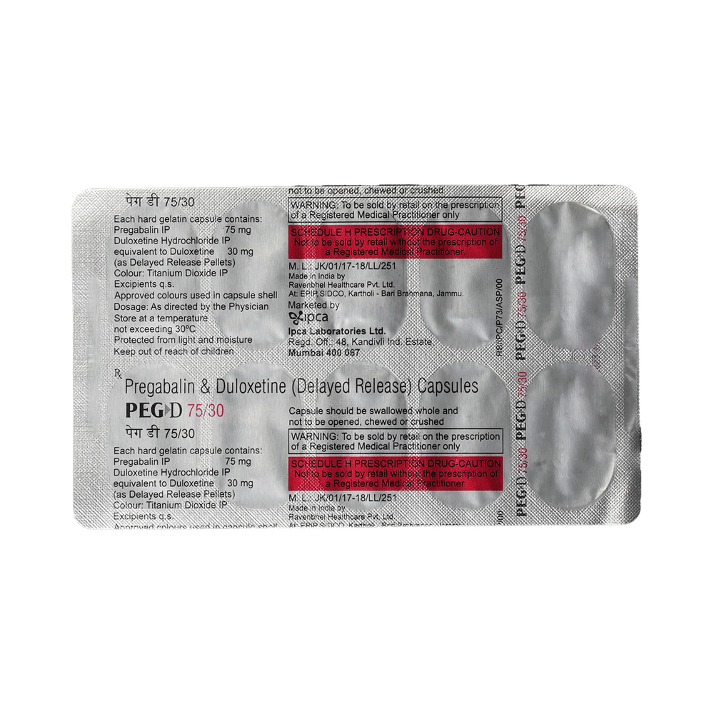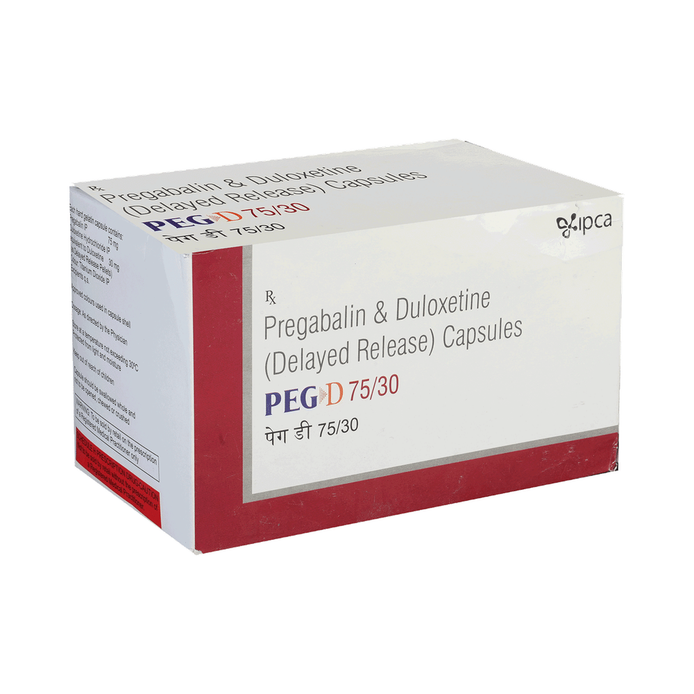 Peg D 75/30 Capsule DR is a combination of two medicines: pregabalin and duloxetine. Pregabalin decreases neurotransmitter release, while duloxetine boosts serotonin and norepinephrine levels to modulate pain perception, working together to relieve nerve pain.