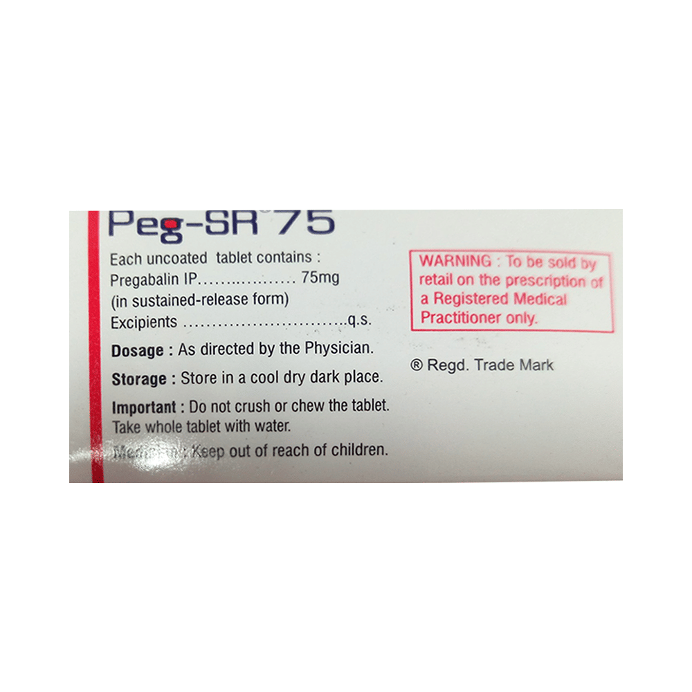 Peg -SR 75 Tablet is a medicine used to relieve pain caused by nerve damage (neuropathic pain) due to diabetes, shingles (herpes zoster infection), spinal cord injury, or other conditions. It is also used to treat widespread muscle pain and stiffness in people with fibromyalgia. Peg -SR 75 Tablet belongs to the anti-epileptic group of medicines and can also be used to treat certain types of seizures (fits) in combination with other medicines. Additionally, it may also be prescribed to treat the symptoms of anxiety disorder if other medicines are not suitable.You can take Peg -SR 75 Tablet with or without food, but it is important to take this medicine at the same time each day to get the most benefit. The exact dose and duration of treatment will depend on your condition and how you respond to it. Your doctor will probably start this medicine at a low dose and increase it gradually. It may take a few weeks for the medicine to work properly. Follow your doctor’s instructions and continue taking it regularly until your doctor advises you to stop. Do not miss any dose, otherwise, your condition may worsen.The side effects of this medicine are usually mild and go away by themselves. The most common ones are feeling sleepy or dizzy, dryness in the mouth, blurred vision, weight gain, edema (swelling over the whole body), and difficulty in concentrating. Most side effects are not serious and do not need medical attention. Talk to your doctor about potential side effects and ways in which you might prevent or cope with them.Before taking the medicine you should tell your doctor if you are pregnant, breastfeeding, or planning to become pregnant. Be careful while driving as sleepiness, dizziness, and blurring of vision may be seen as side effects. You should avoid drinking alcohol along with this medicine as it may lead to excessive sleepiness and dizziness.