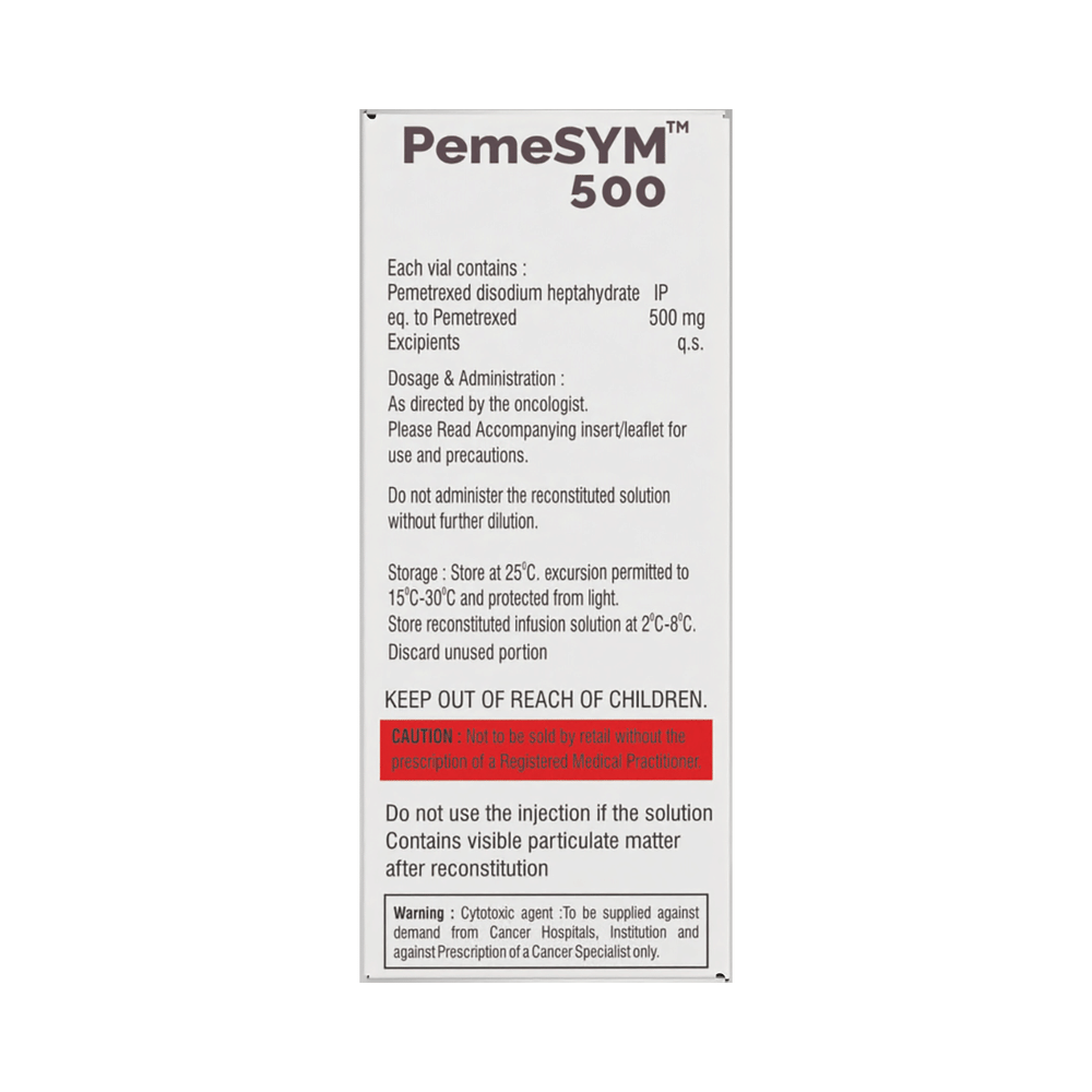 Pemesym 500 Injection is used in the treatment of non-small cell lung cancer and malignant pleural mesothelioma. Pemesym 500 Injection is given as an injection by a qualified medical professional. Your doctor will decide what dose is necessary and how often you need to take it. This will depend on what you are being treated for and may change from time to time. You should take it exactly as your doctor has advised. Taking it in the wrong way or taking too much can cause very serious side effects. It may take several weeks or months for you to see or feel the benefits but do not stop taking it unless your doctor tells you to.The most common side effects of this medicine include nausea, vomiting, loss of appetite, and hair loss. This medicine may reduce the number of blood cells (decrease red blood and white blood cells) in your blood, thereby, increasing the susceptibility to infections. Regular blood tests are required to check your blood cells along with heart, liver and blood uric acid levels.Before taking it, tell your doctor if have heart disease, liver, or kidney problems or are taking any medicines to treat infections. Many other medicines can affect, or be affected by, this medicine so let your doctor know all medications you are using.This medicine is not recommended during pregnancy or while breastfeeding. Use of effective contraception by both males and females during treatment is important to avoid pregnancy.