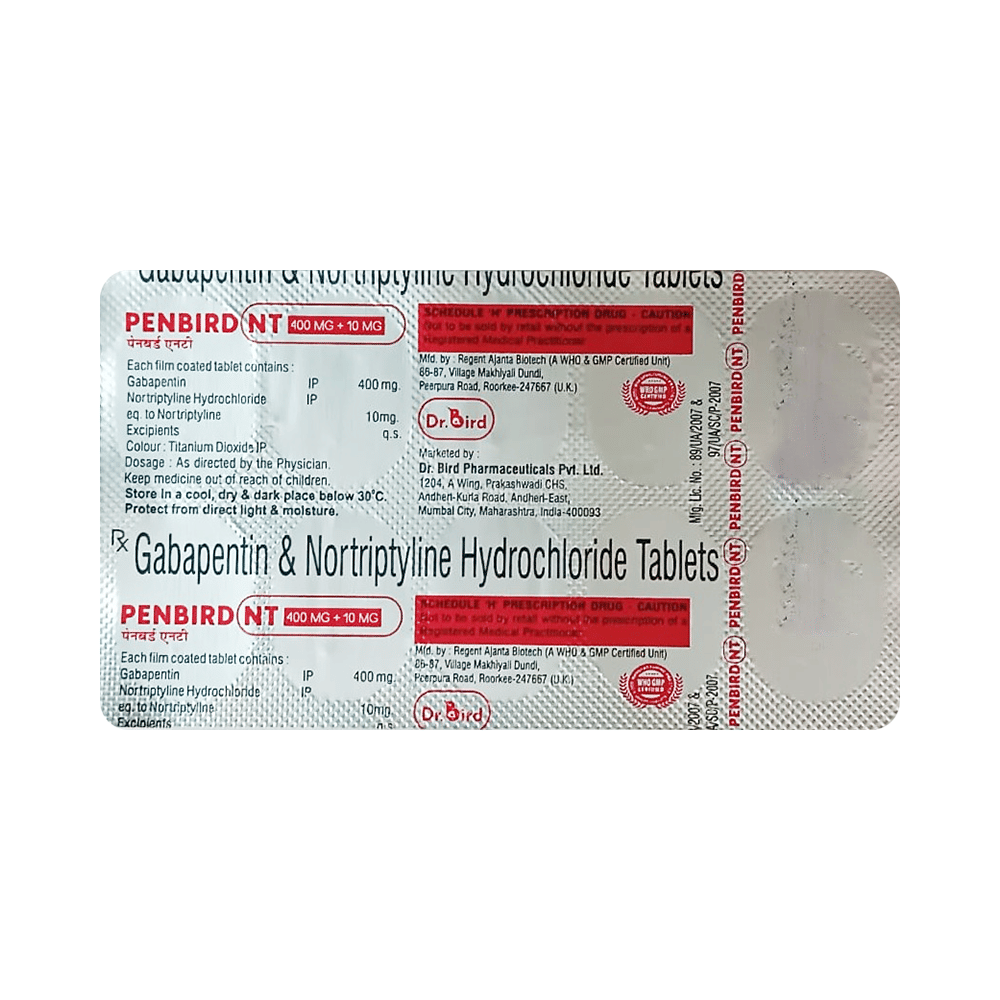 Penbird NT 400 MG+10 MG Tablet is a combination medicine used for the treatment of neuropathic pain. This medicine decreases the pain by stopping the movement of pain signals to the brain. Penbird NT 400 MG+10 MG Tablet is taken by mouth, with or without food and preferably at night. It is advised to take it at a fixed time each day to maintain a consistent level of medicine in the blood. In case you miss a dose of this medicine, take it as soon as you remember. Finish the full course of treatment even if you feel better. It is important not to stop taking this medicine suddenly without talking to the doctor as it may worsen your symptoms.Some common side effects of this medicine constipation, difficulty in urination, weight gain, tiredness, and dryness in mouth. It may also cause dizziness and sleepiness, so do not drive or do anything that requires mental focus until you know how this medicine affects you. This medicine may cause weight gain and to control it, you should exercise regularly and take a balanced diet. Remember to inform the doctor if you develop any unusual changes in mood as this medicine may lead to suicidal thoughts.Before taking this medicine let your doctor know if you suffer from kidney or liver disease. Your doctor should also know about all other medicines you are taking as many of these may make this medicine less effective or change the way it works. Inform your doctor if you are pregnant, planning pregnancy or breastfeeding.