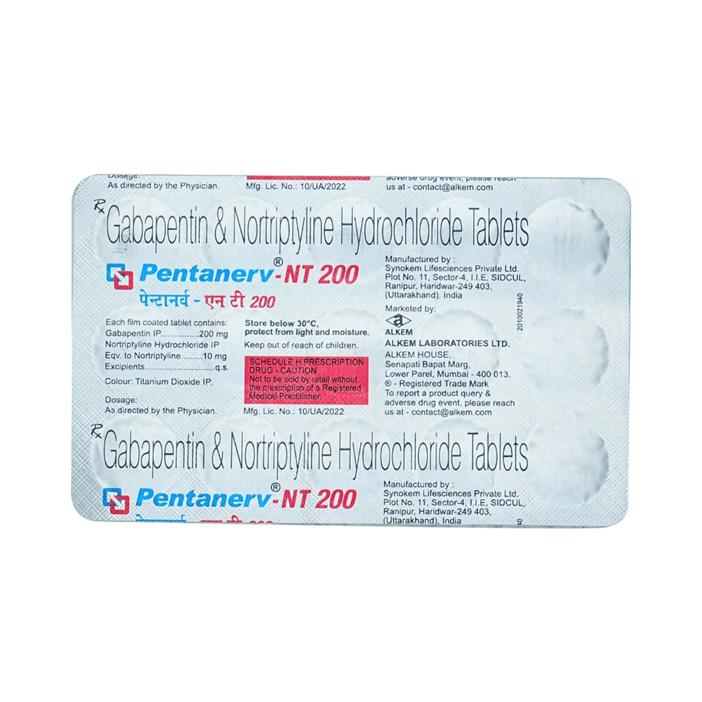 pentanerv NT 200mg/10mg Tablet is a combination of two medicines: Gabapentin and Nortriptyline. Gabapentin is an alpha 2 delta ligand which decreases the pain by modulating calcium channel activity of the nerve cells. Nortriptyline is a tricyclic antidepressant which increases the levels of chemical messengers (serotonin and noradrenaline) that stop the movement of pain signals in the brain. Together, they relieve neuropathic pain (pain from damaged nerves).