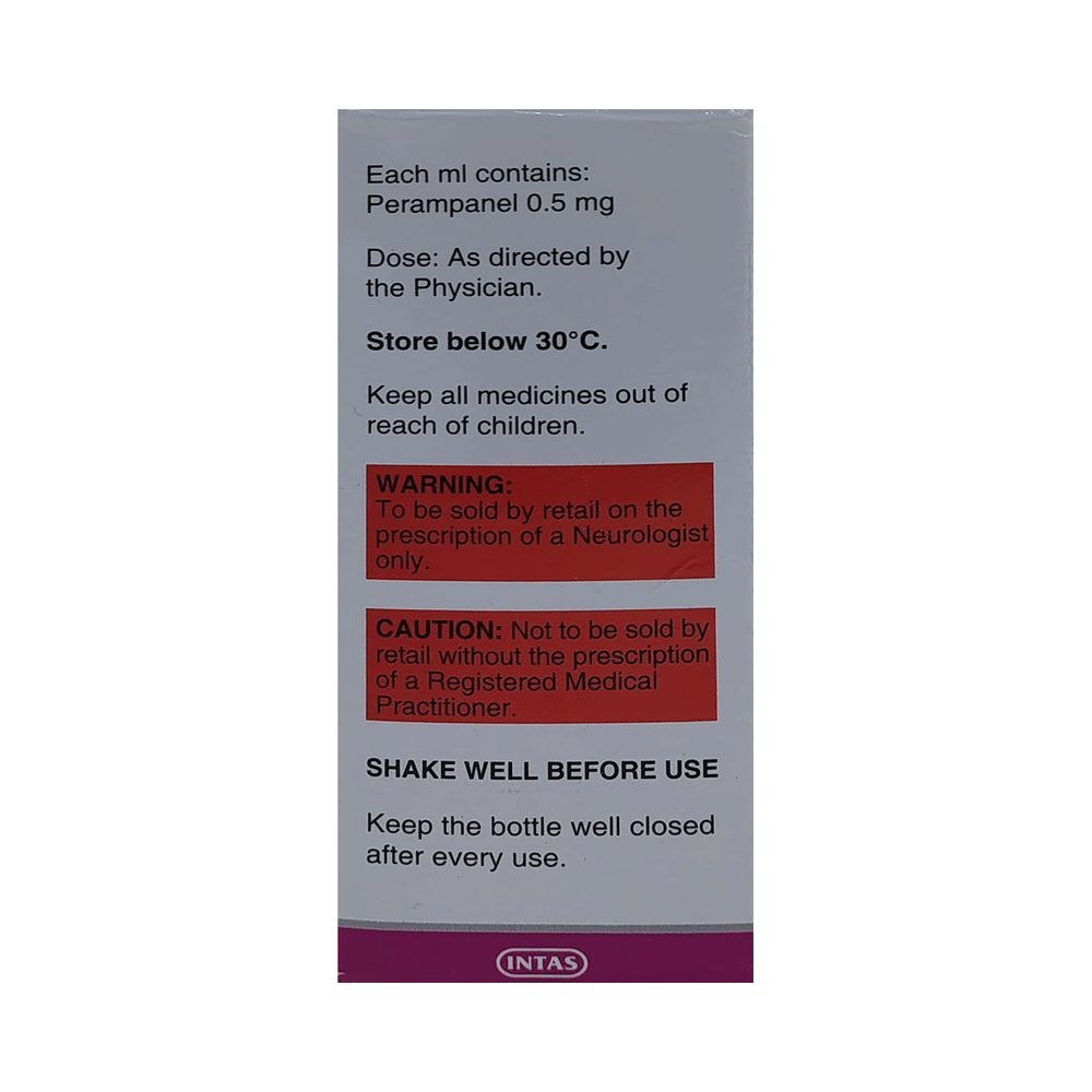 Perampa Oral Suspension belongs to a class of medicines known as antiepileptics. It is used to treat epilepsy (seizures) in people who have repeated seizures (fits). It helps reduce the frequency of seizures that affect a part or whole of the brain. Perampa Oral Suspension is taken by mouth with or without food. However, it is advised to take it at the same time each day, preferably before going to bed. Take this medicine in the dose and duration as advised by your doctor as it has a high potential of habit-forming. If you have missed a dose, take it as soon as you remember it. Do not skip any doses and finish the full course of treatment even if you feel better. Do not stop taking it suddenly without talking to your doctor as it may increase seizure frequency.Some common side effects of this medicine include fatigue, anger, nausea, and balance disorder (loss of balance). It may also cause dizziness and sleepiness, so do not drive or do anything that requires mental focus until you know how this medicine affects you. This medicine may cause weight gain and to control it, you should have a balanced diet and exercise regularly. It is important to inform your doctor if you develop any unusual changes in mood or depression as it may lead to suicidal thoughts.Before taking it, you should tell your doctor if you have kidney problems, depression, or suicidal thoughts and if you are pregnant or planning to become pregnant. You should not breastfeed while taking this medicine. Alcohol may increase the risk of seizures and worsen the side effects such as drowsiness and dizziness. Avoid alcohol while taking this medicine. Your kidney function may need to be tested often while taking this medicine.