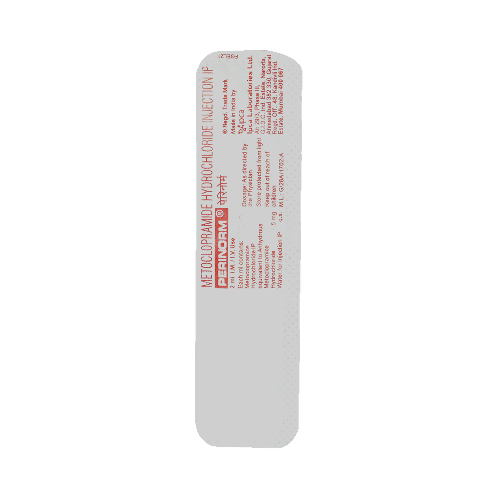 Perinorm Injection is a prescription medicine used to treat nausea, vomiting, indigestion, and heartburn. It prevents the feeling of fullness during or shortly after a meal and help reduce symptoms caused by the flow of the stomach contents back into the food pipe. Perinorm Injection is given by your doctor or nurse. The dose you are given will depend on your condition and how you respond to the medicine. You should take this medicine until your doctor tells you to stop. Let your doctor know about all other medications you are taking as some may affect, or be affected by this medicine.The most common side effects are restlessness, fatigue, and weakness. Most of these are temporary and usually resolve with time. Contact your doctor straight away if you are at all concerned about any of these side effects. It also causes drowsiness, so do not drive or do anything that requires mental focus until you know how this medicine affects you. Avoid drinking alcohol while taking this medicine as it can worsen your sleepiness. This medicine may also cause diarrhea, so it is better to take plenty of fluids while taking this medicine as it may help to prevent dehydration.Before taking this medicine, you should let your doctor know if you have liver or kidney problems. Pregnant or breastfeeding women should also consult their doctor.