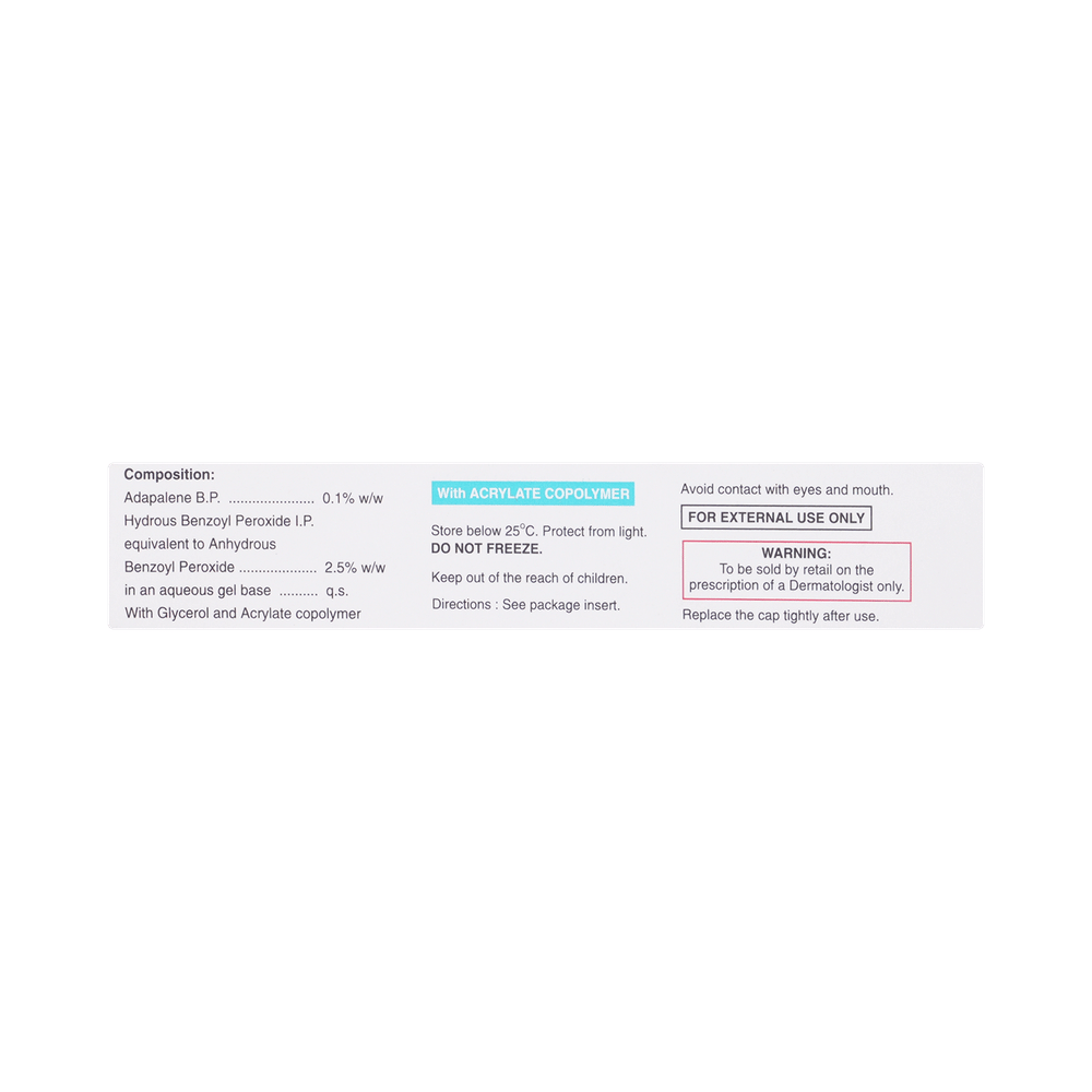 Salt Composition: Adapalene (0.1% w/w) + Benzoyl Peroxide (2.5% w/w)
