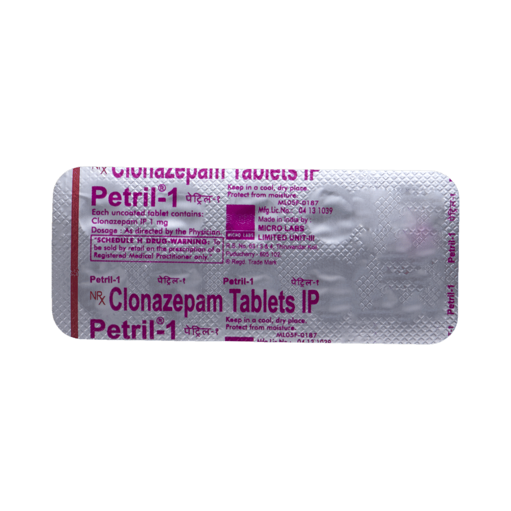 Petril 1 Tablet is a prescription medicine used to treat epilepsy (seizures) and anxiety disorder. It helps to decrease the abnormal and excessive activity of the nerve cells and calms the brain. Petril 1 Tablet may be taken with or without food. However, take it at the same time each day as this helps to maintain a consistent level of medicine in the body. Take this medicine in the dose and duration as advised by your doctor as it has a high potential of habit-forming. If you have missed a dose, take it as soon as you remember it and finish the full course of treatment even if you feel better. You should not stop this medicine suddenly without talking to your doctor as it may increase the seizure frequency and can cause nausea, anxiety, flu-like symptoms, and muscle pain.Some common side effects of this medicine include fatigue, depression and impaired coordination. It may also cause dizziness and sleepiness, so do not drive or do anything that requires mental focus until you know how this medicine affects you. It is important to inform your doctor if you develop any unusual changes in mood or depression as this medicine may cause suicidal thoughts.