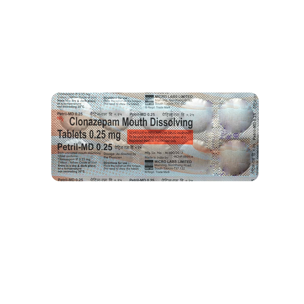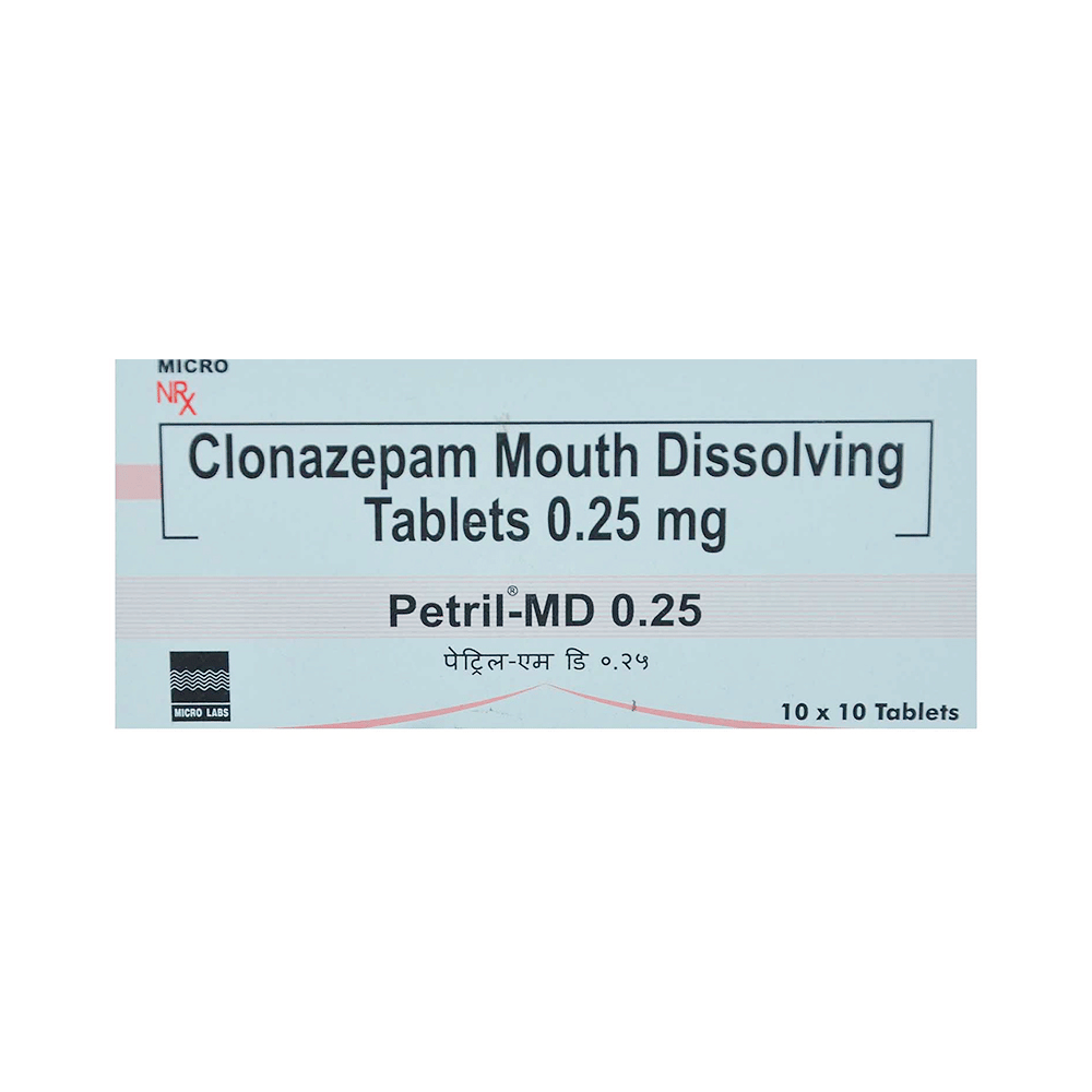 Petril-MD 0.25 Tablet is a prescription medicine used to treat epilepsy (seizures) and anxiety disorder. It helps to decrease the abnormal and excessive activity of the nerve cells and calms the brain. Petril-MD 0.25 Tablet may be taken with or without food. However, take it at the same time each day as this helps to maintain a consistent level of medicine in the body. Take this medicine in the dose and duration as advised by your doctor as it has a high potential of habit-forming. If you have missed a dose, take it as soon as you remember it and finish the full course of treatment even if you feel better. You should not stop this medicine suddenly without talking to your doctor as it may increase the seizure frequency and can cause nausea, anxiety, flu-like symptoms, and muscle pain.Some common side effects of this medicine include fatigue, depression and impaired coordination. It may also cause dizziness and sleepiness, so do not drive or do anything that requires mental focus until you know how this medicine affects you. It is important to inform your doctor if you develop any unusual changes in mood or depression as this medicine may cause suicidal thoughts.