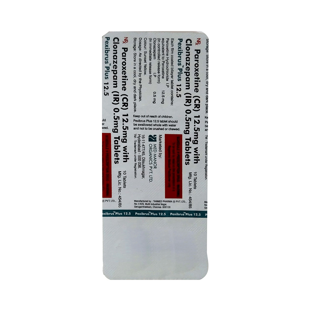 Pexibrus Plus 12.5 Tablet IR is a combination of two medicines, paroxetine and clonazepam, which have mood-enhancing and anxiety-lowering effects. Paroxetine is a selective serotonin reuptake inhibitor (SSRI), which increases the levels of serotonin, a chemical messenger that improves mood. Clonazepam is a benzodiazepine (BZD) that increases the action of GABA, a chemical messenger that suppresses the abnormal activity of the nerve cells in the brain.