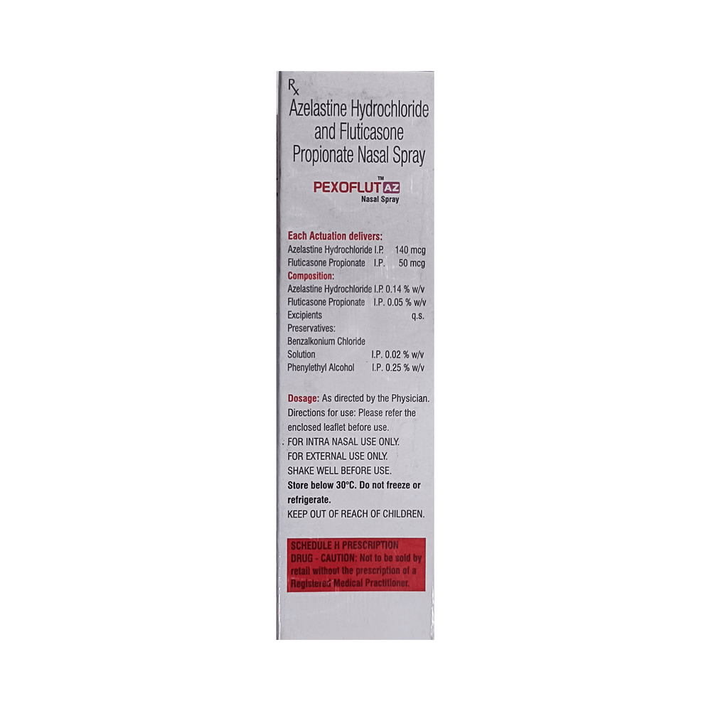 Pexoflut AZ Nasal Spray is a combination of two medicines: Fluticasone Propionate and Azelastine, which relieves sneezing and runny nose caused due to allergies (allergic rhinitis). Fluticasone Propionate is a steroid which works by blocking the release of certain chemical messengers that cause inflammation (swelling) and irritation in the nose. Azelastine is an antiallergic which relieves allergy symptoms like runny nose, watery eyes and sneezing.