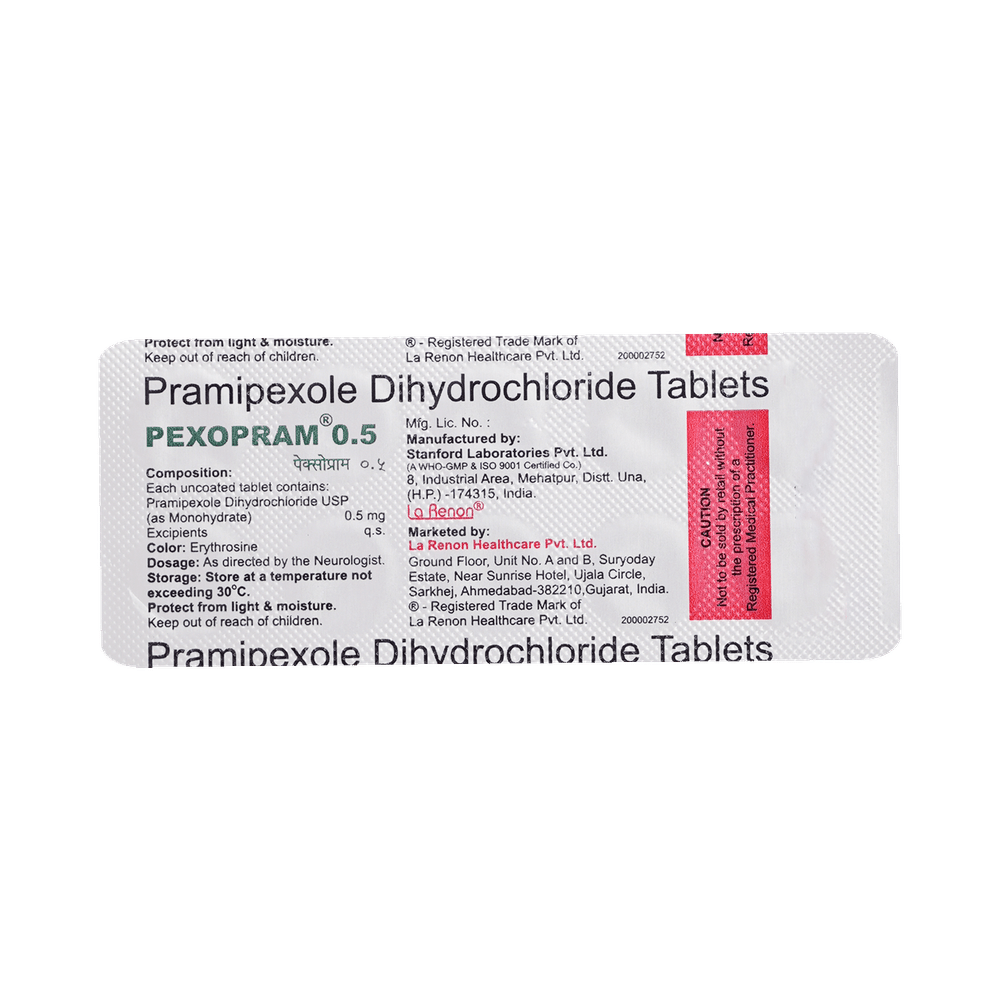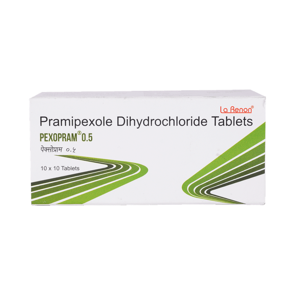 Pexopram 0.5mg Tablet is used in the treatment of Parkinson's disease and restless leg syndrome (an urge to move the legs usually accompanied or caused by uncomfortable and unpleasant leg sensations). It helps to treat excessive shaking by slowing down the body movements. Pexopram 0.5mg Tablet should be taken with food. However, take it at the same time each day as this helps to maintain a consistent level of medicine in the body. Take this medicine in the dose and duration as advised by your doctor and if you have missed a dose, take it as soon as you remember it. You should never skip any doses and finish the full course of treatment even if you feel better. This medication must not be stopped suddenly without talking to your doctor.Some common side effects of this medicine include nausea, dry mouth, fatigue, hallucinations, constipation, and peripheral edema. It also causes dizziness and sleepiness, so do not drive or do anything that requires mental focus until you know how this medicine affects you. Inform your doctor if you develop any unusual changes in mood, an abnormally high sex drive, an urge to gamble, or uncontrolled spending as these may prove very harmful.