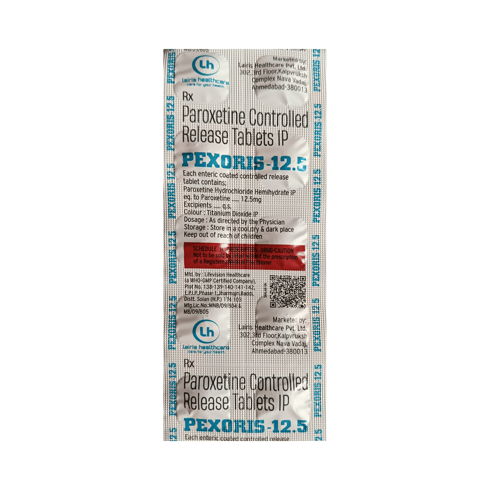 Pexoris 12.5 Tablet CR is a selective serotonin reuptake inhibitor (SSRI) antidepressant. It works by increasing the levels of serotonin, a chemical messenger in the brain. This improves mood and physical symptoms of depression and also relieves symptoms of panic disorder, anxiety, and obsessive-compulsive disorder.
