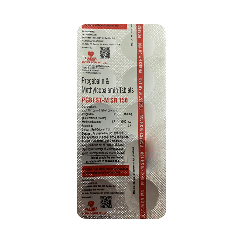 Pgbest-M SR 150 Tablet is a combination of two medicines: Methylcobalamin and Pregabalin. Methylcobalamin is a form of vitamin B, which helps in the production of myelin, a substance that protects nerve fibers and rejuvenates damaged nerve cells. Pregabalin is an alpha-2 delta ligand that decreases pain by modulating the calcium channel activity of the nerve cells. Together, they relieve neuropathic pain (pain from damaged nerves).