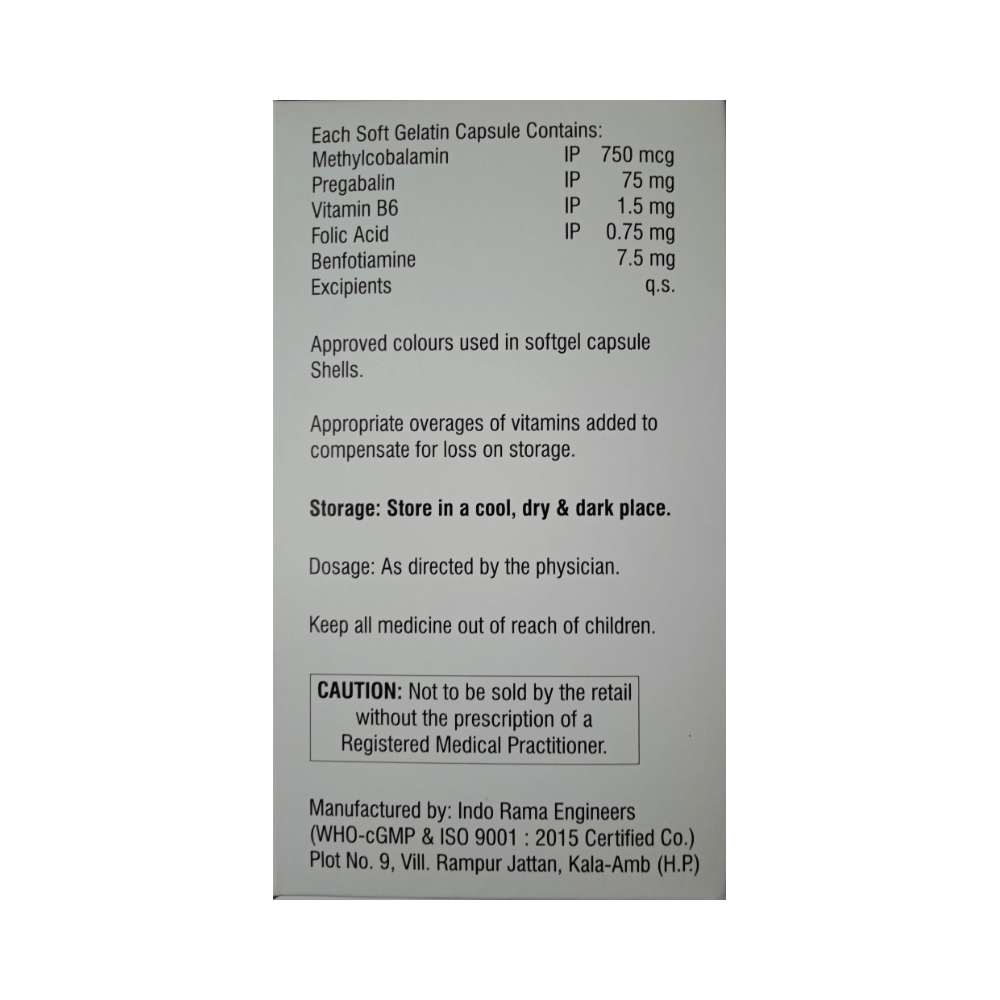 Salt Composition: Benfotiamine (7.5mg) + Folic Acid (0.75mg) + Methylcobalamin (750mcg) + Pregabalin (75mg) + Vitamin B6 (Pyridoxine) (1.5mg)