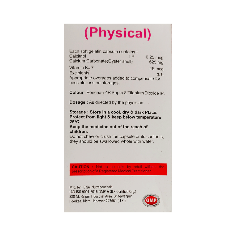 Physical Softgel Capsule is a combination of Calcitriol, Calcium Carbonate, and Vitamin K2-7. Calcitriol is the active form of Vitamin D. It raises Vitamin D levels in your blood. This in turn raises calcium levels in your blood by helping you absorb more calcium from your intestine. Calcium carbonate is a dietary supplement used when the amount of calcium taken in the diet is not enough. Vitamin K2-7 plays a central role in the metabolism of calcium, the main mineral found in your bones and teeth. Vitamin K2-7 activates the calcium-binding actions of two proteins : matrix GLA protein and osteocalcin, which help to build and maintain bone health.
