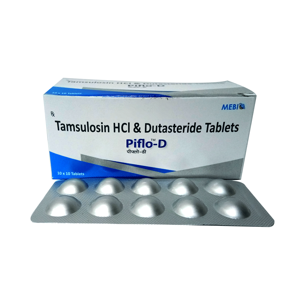 In Treatment of Benign prostatic hyperplasiaWhen your prostate gland becomes enlarged it can cause urinary problems such as difficulty passing urine and a need to go to the toilet frequently or urgently. It can also cause urine flow to be slower. If not treated, there is a risk that your urine flow will be completely blocked. Piflo D 0.4mg/0.5mg Tablet is a combination of two medicines: dutasteride and tamsulosin. Dutasteride reduces the size of your prostate by blocking the production of a hormone which causes it to grow. Tamsulosin works by relaxing muscles in the bladder and prostate. Together they can rapidly relieve the symptoms and make it easier for you to urinate. However, it may take up to 6 months to notice the full benefit. Take this medicine exactly as prescribed for maximum benefits.