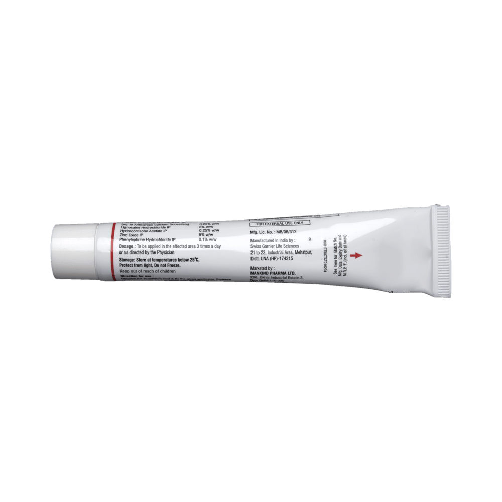 Salt Composition: Lidocaine (3% w/w) + Calcium Dobesilate (0.25% w/w) + Hydrocortisone (0.25% w/w) + Phenylephrine (0.1% w/w) + Zinc Oxide (5% w/w) + Troxerutin (2% w/w)