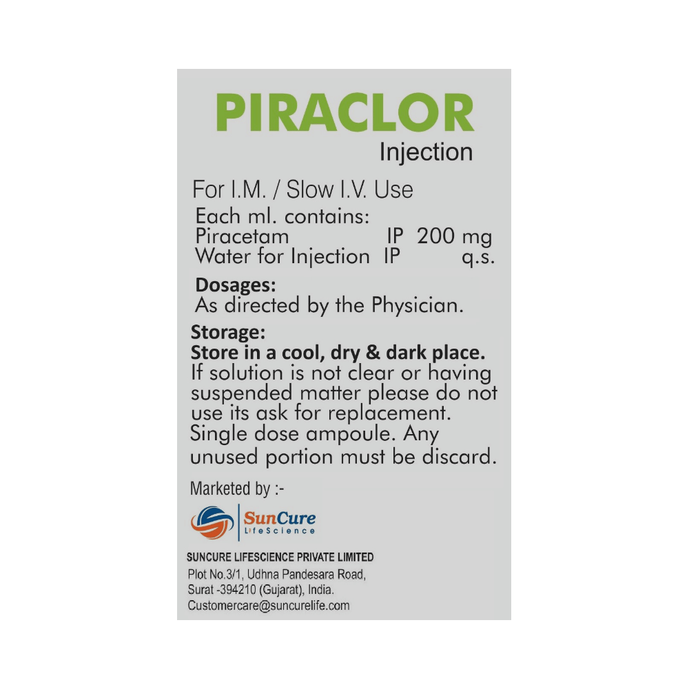 Piraclor Injection is a nootropic medicine. It works by increasing the activity of a chemical messenger (acetylcholine) which improves communication between the nerve cells. It also protects the brain and nervous system against shortness of oxygen.