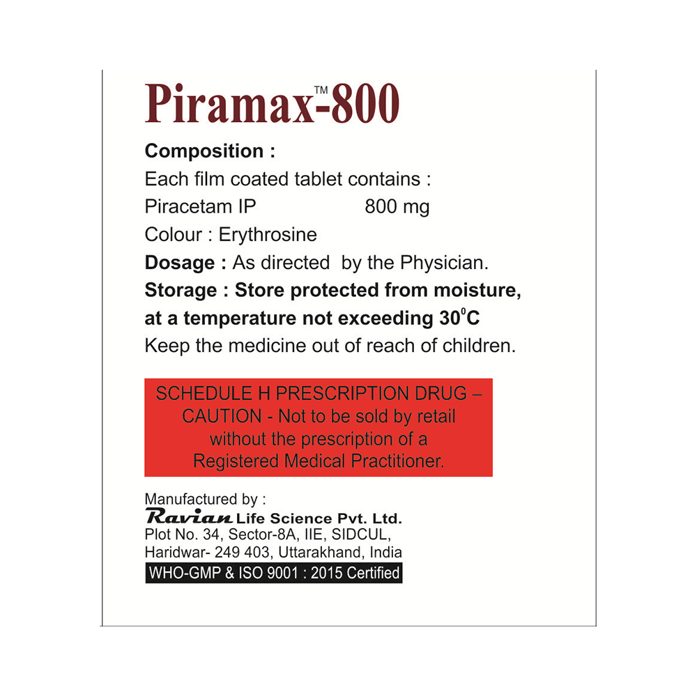 Piramax 800 Tablet is used in the treatment of memory loss in Alzheimer's disease. It can also be used to treat age-related and post-traumatic memory loss. It works by improving communication between the nerve cells and protects the brain. Piramax 800 Tablet is sometimes used to help manage sickle cell disease. It can reduce the number of painful episodes called vaso-occlusive crises by improving blood flow and preventing blood cells from sticking together.Piramax 800 Tablet should be taken by mouth with or without food. It is advisable to take this medicine at the same time each day to maintain a consistent level in the blood. Do not skip any doses and finish the full course of treatment even if you feel better. This medication mustn't be stopped suddenly, as it may result in twitching or jerking movements, and even relapse of the disease may occur.Some common side effects of this medicine include nervousness and abnormality of voluntary movements. It may also cause dizziness and sleepiness, so do not drive or do anything that requires mental focus. This medicine may cause weight gain; therefore, you should have a balanced diet and exercise regularly.This medicine can affect platelet aggregation, so inform your doctor if you have bleeding problems or if you are on medications that help make blood thin. Pregnant and breastfeeding women should consult their doctors before taking this medicine.