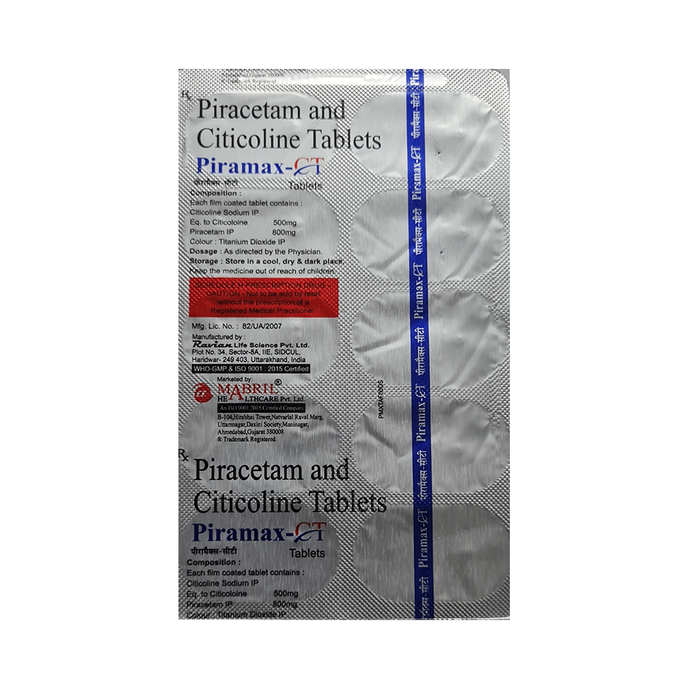 Piramax-CT Tablet is a medicine used in stroke rehabilitation and as a cognitive enhancer. It protects the nerve cells in the brain from damage and also helps to repair the damaged nerve cells. It may also be used in the treatment of brain trauma. Piramax-CT Tablet may be taken with or without food, preferably at the same time each day. Take it at the same time each day as this helps to maintain a consistent level of medicine in the body. Take this medicine in the dose and duration as advised by your doctor and if you have missed a dose, take it as soon as you remember it. Do not skip any doses and finish the full course of treatment even if you feel better. It is important that this medication is not stopped suddenly without talking to your doctor as it may worsen your symptoms.Some common side effects of this medicine include hyperactivity, stomach pain, nervousness, and decreased blood pressure. However, these are temporary and usually resolve on their own. Please consult your doctor if these do not subside or bother you. Drink plenty of fluids to keep yourself hydrated while taking this medicine as this medicine may cause diarrhea. This medicine may cause weight gain and to control it, you should have a balanced diet and exercise regularly.