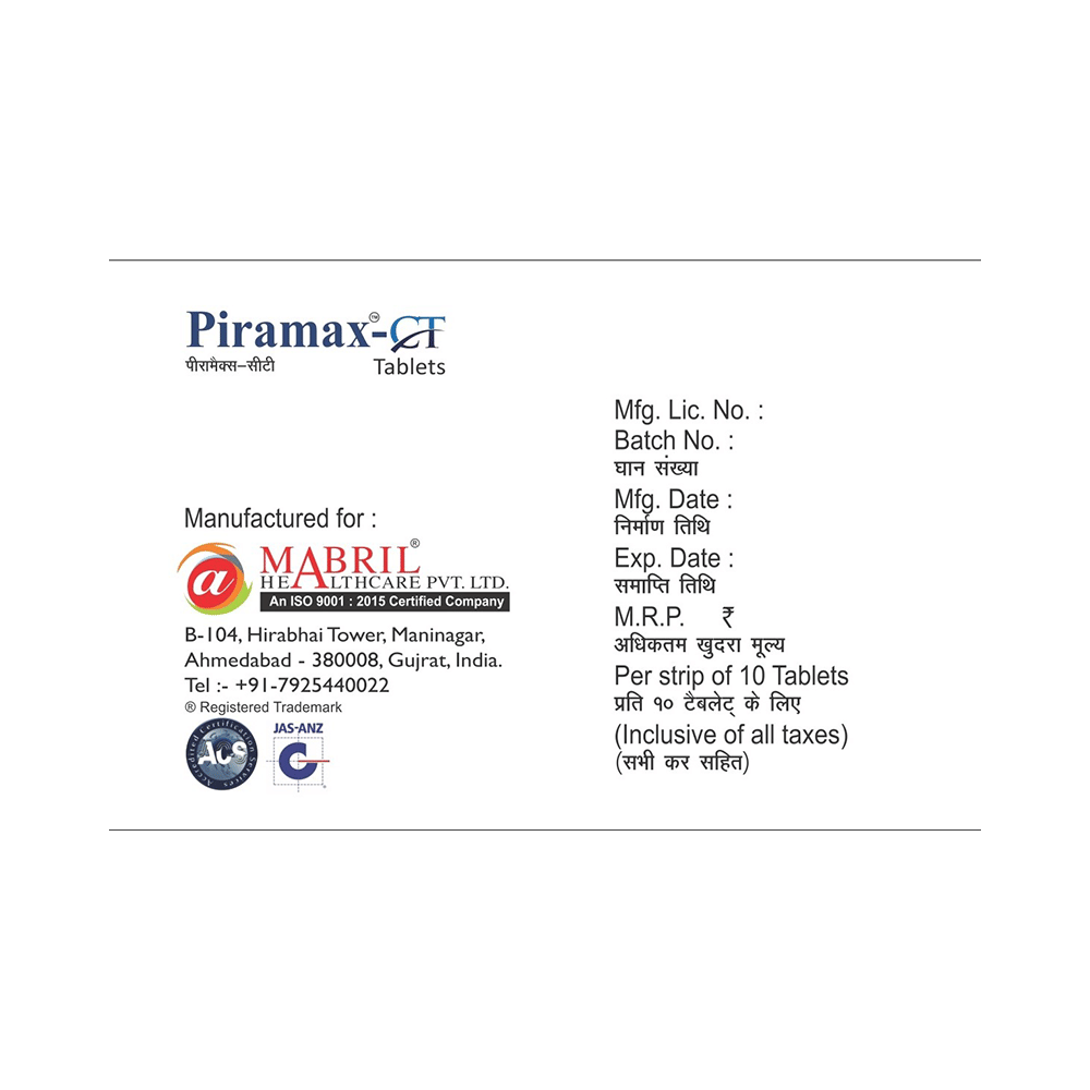 Take this medicine in the dose and duration as advised by your doctor. Swallow it as a whole. Do not chew, crush or break it. Piramax-CT Tablet may be taken with or without food, but it is better to take it at a fixed time.